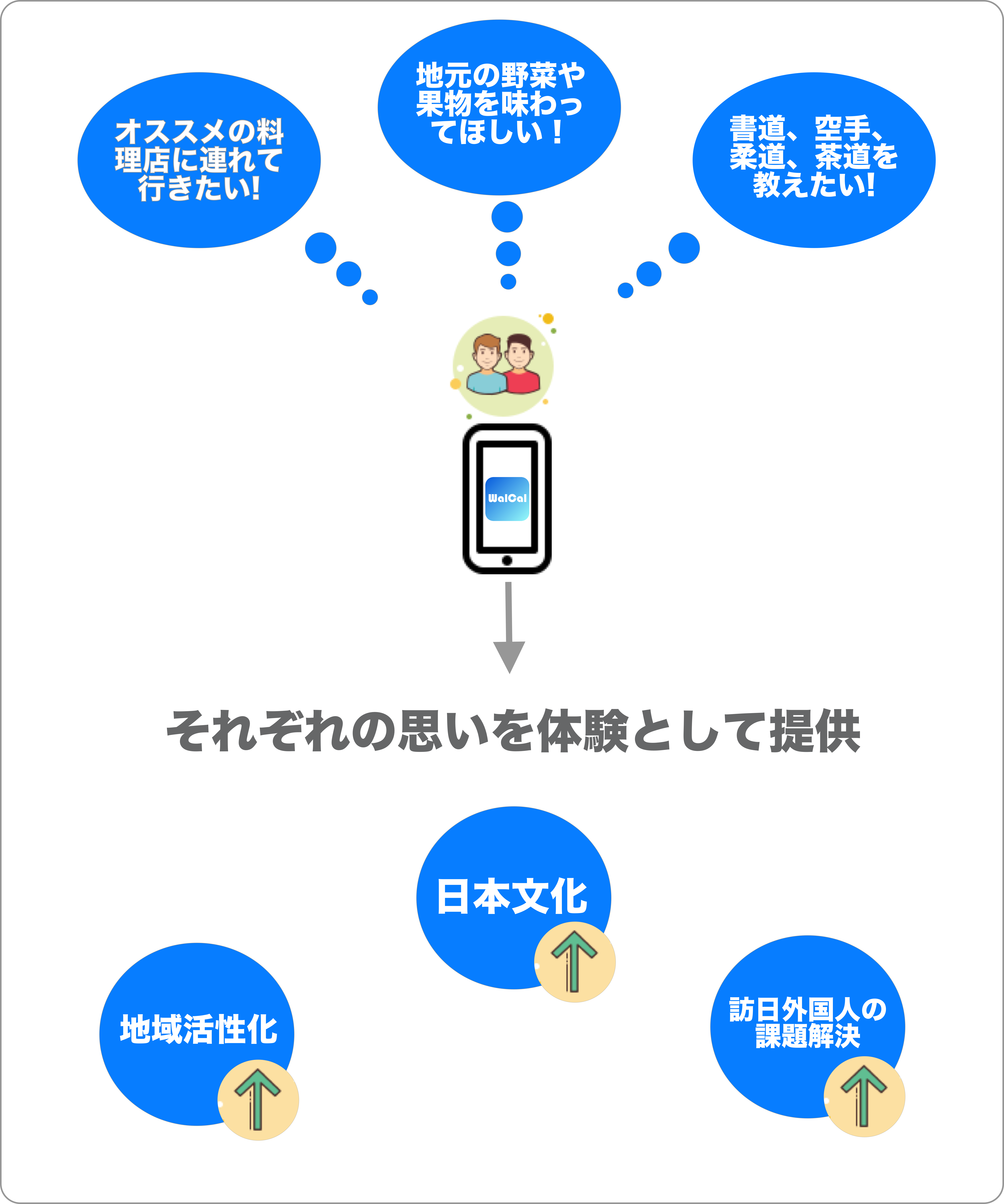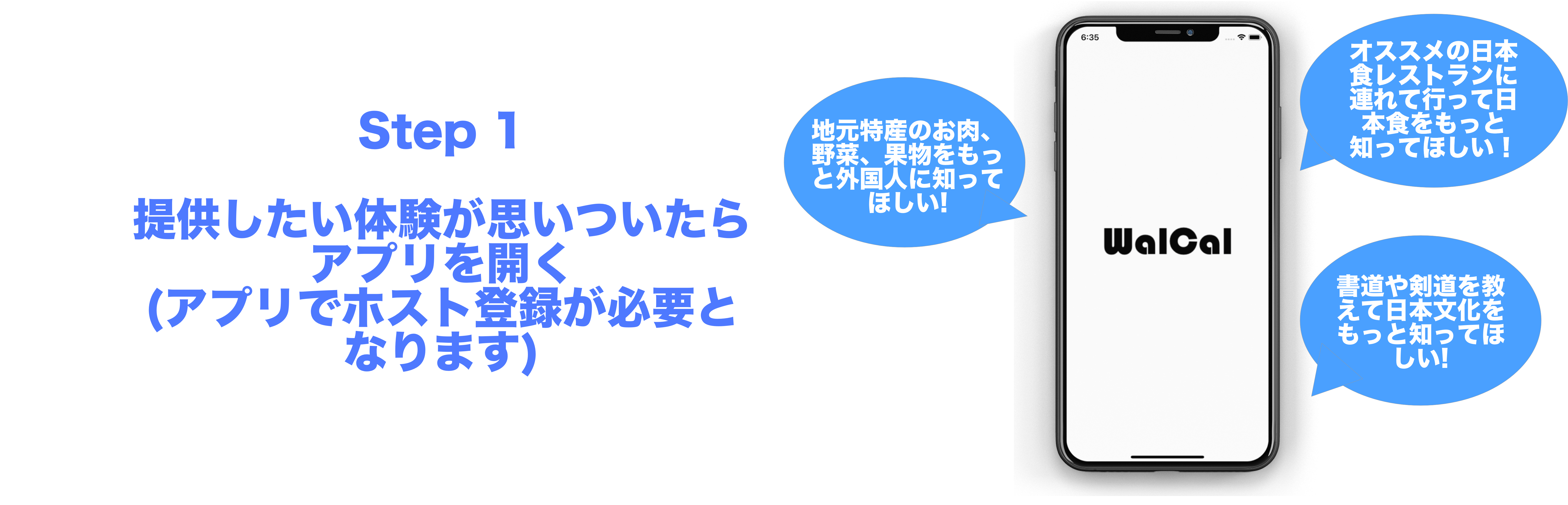 WalCalはそんな思いを体験として、好きな時間に、好きな値段で外国人や留学生に提供出来るサービス(アプリ)です。