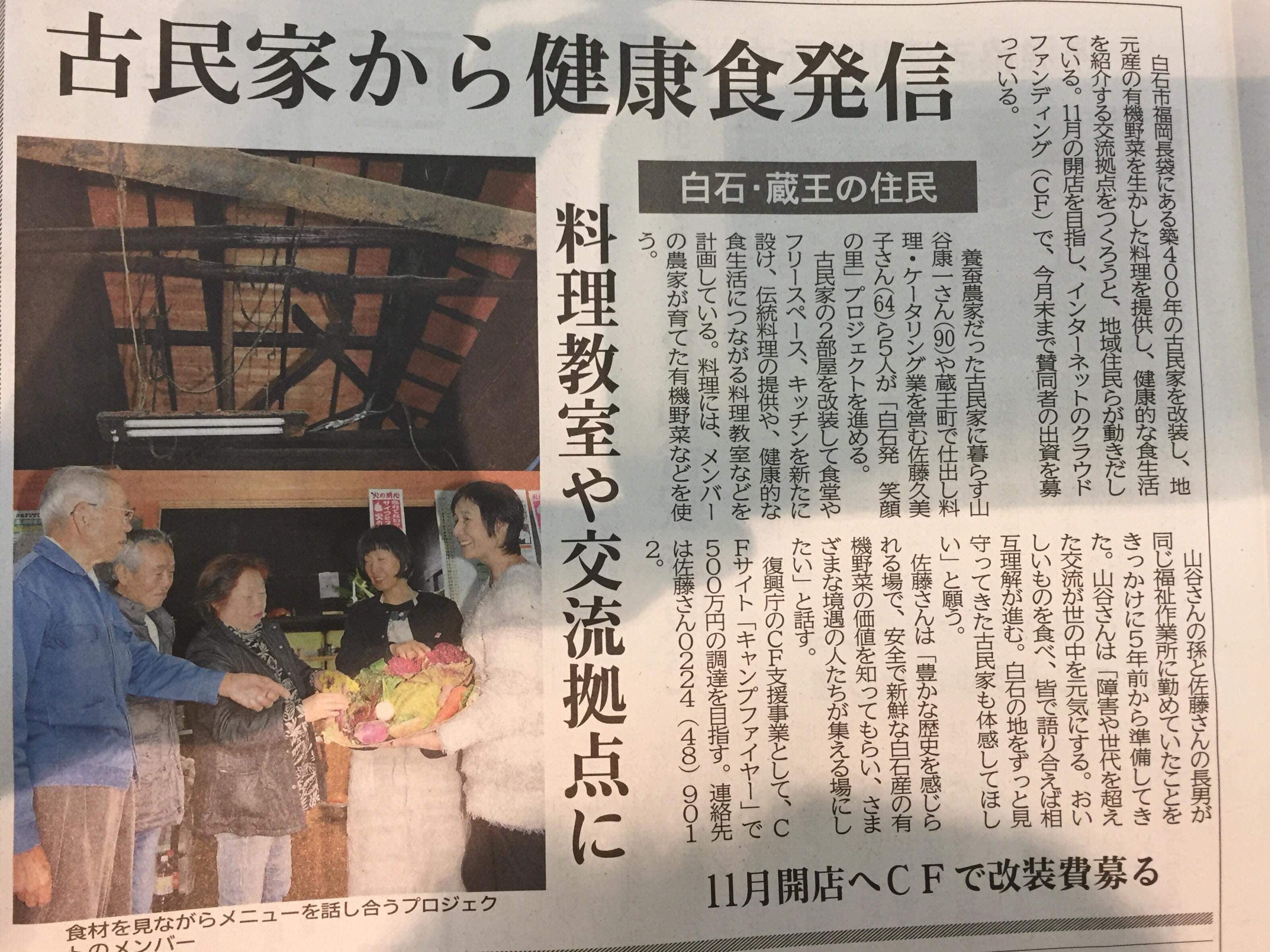 今回のプロジェクトでは、“オーガニック”という付加価値による白石産野菜のブランディングが行えるとともに、安全で新鮮な野菜の美味しさを知ってもらうことができます。これをきっかけに、地場野菜の購買意欲を刺激し白石の農業の活性化につなげたい。併せて、食事や料理教室等への参加で古民家を訪れていただければ、文化保存の必要性認識とコミュニティ再生にも寄与できると考えています。歴史を感じさせる古民家を舞台にオーガニック野菜&伝統料理の提供&料理教室等のワークショップ、という組み合わせで活動していきたいのです。