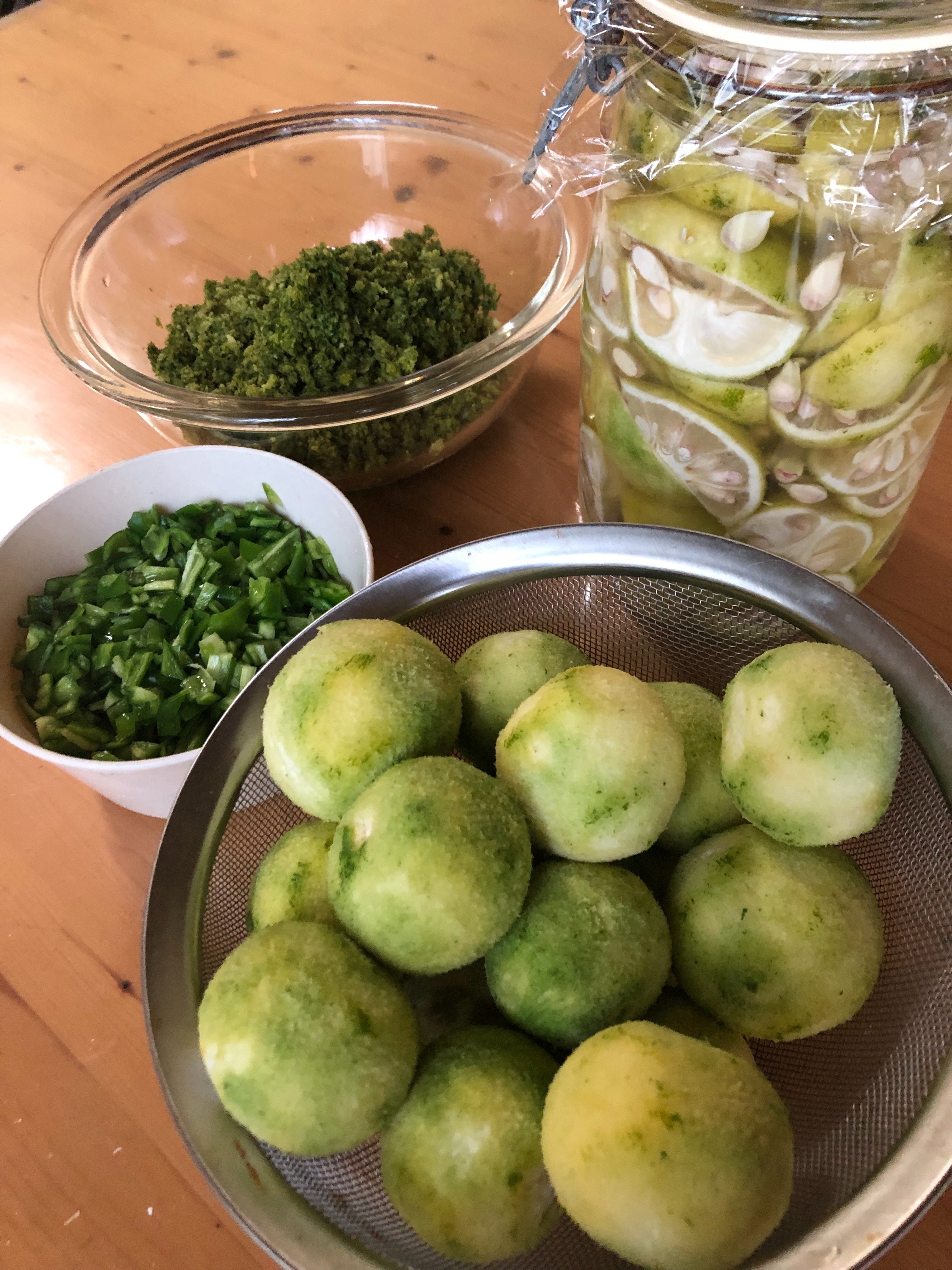 何度かやってみて、柚子は卸金で皮の部分だけをおろすのが一番良いようにおもいます。が、これが大変(汗)皮の白い部分をなるべく入れないように摺るので、とーっても時間がかかります。1日がかりで2キロほど摺ることができました。家中が鮮烈な青柚子の香りに包まれ、大変ですが幸せな時間でもあります。
