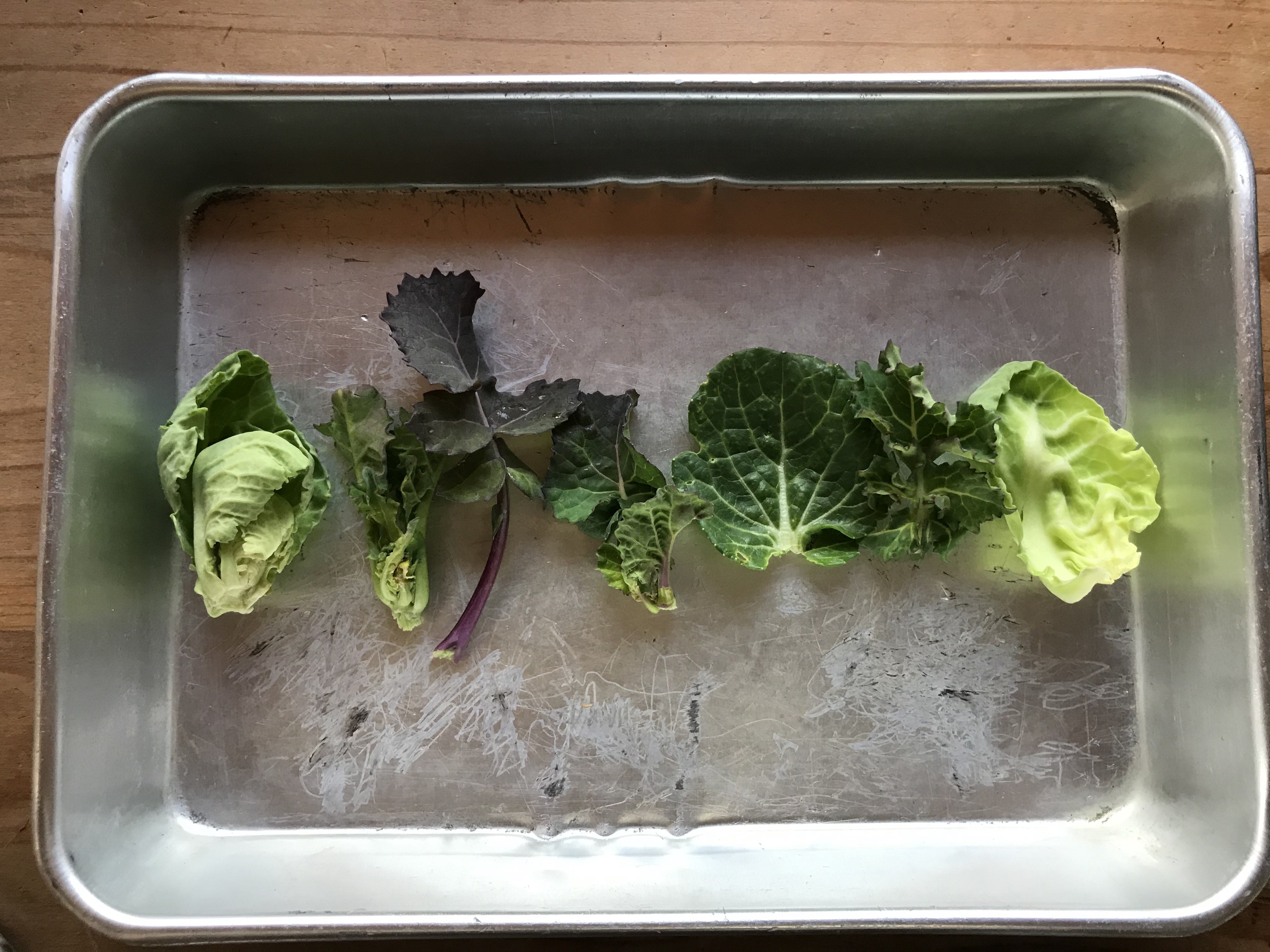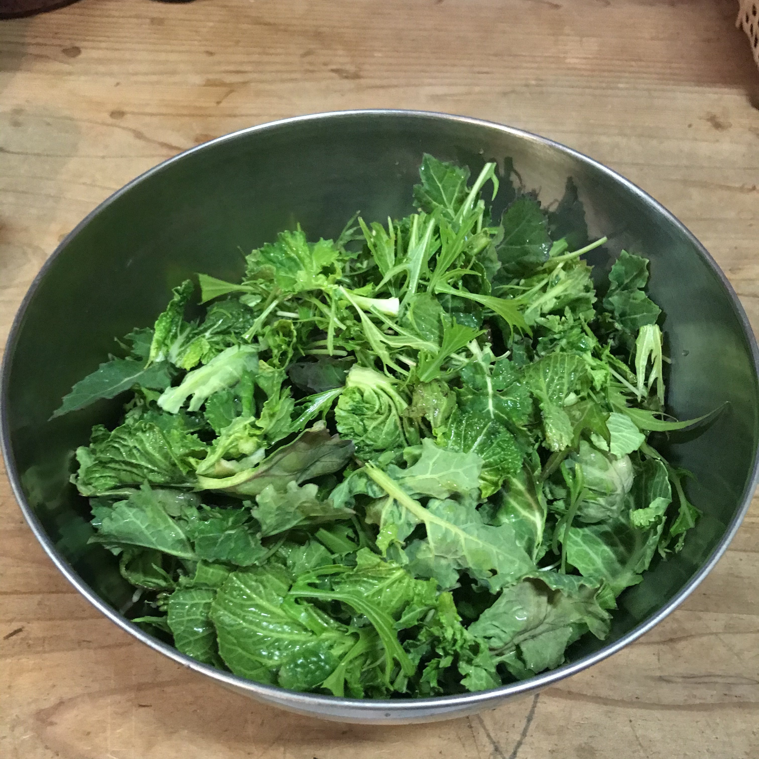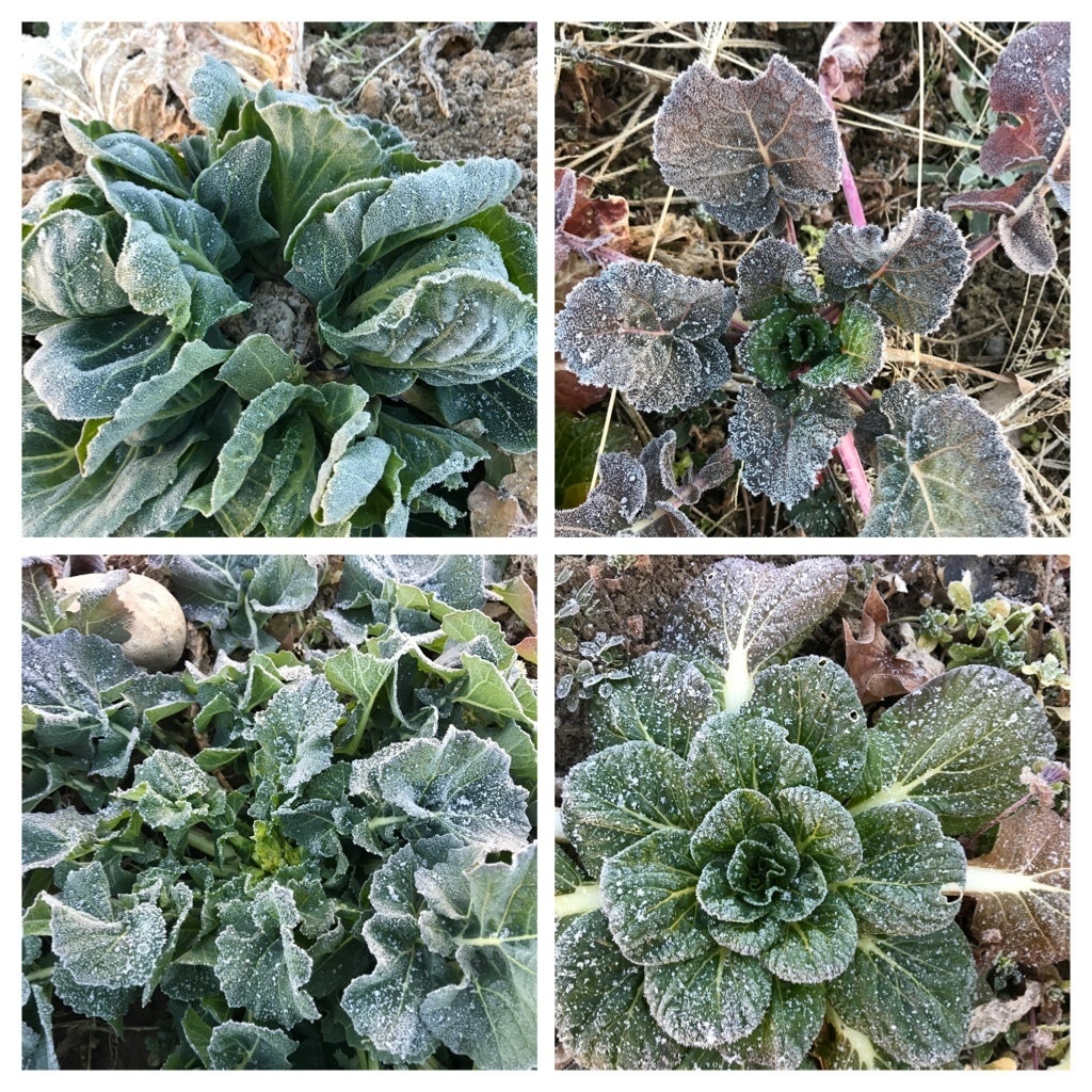 キャベツの収穫後の脇芽、こぼれ種であちこちに出没している蕾菜や雪菜と思われるロゼットたち。霜にあたり固いのですが、甘いのです。贅沢に真ん中の柔らかい部分だけ!