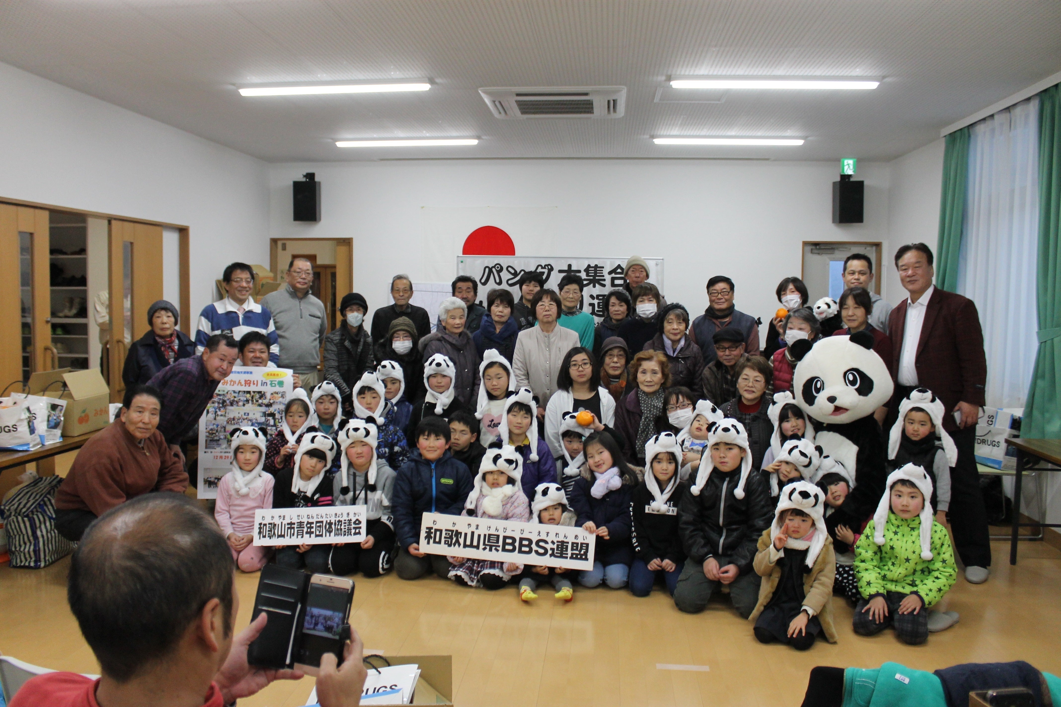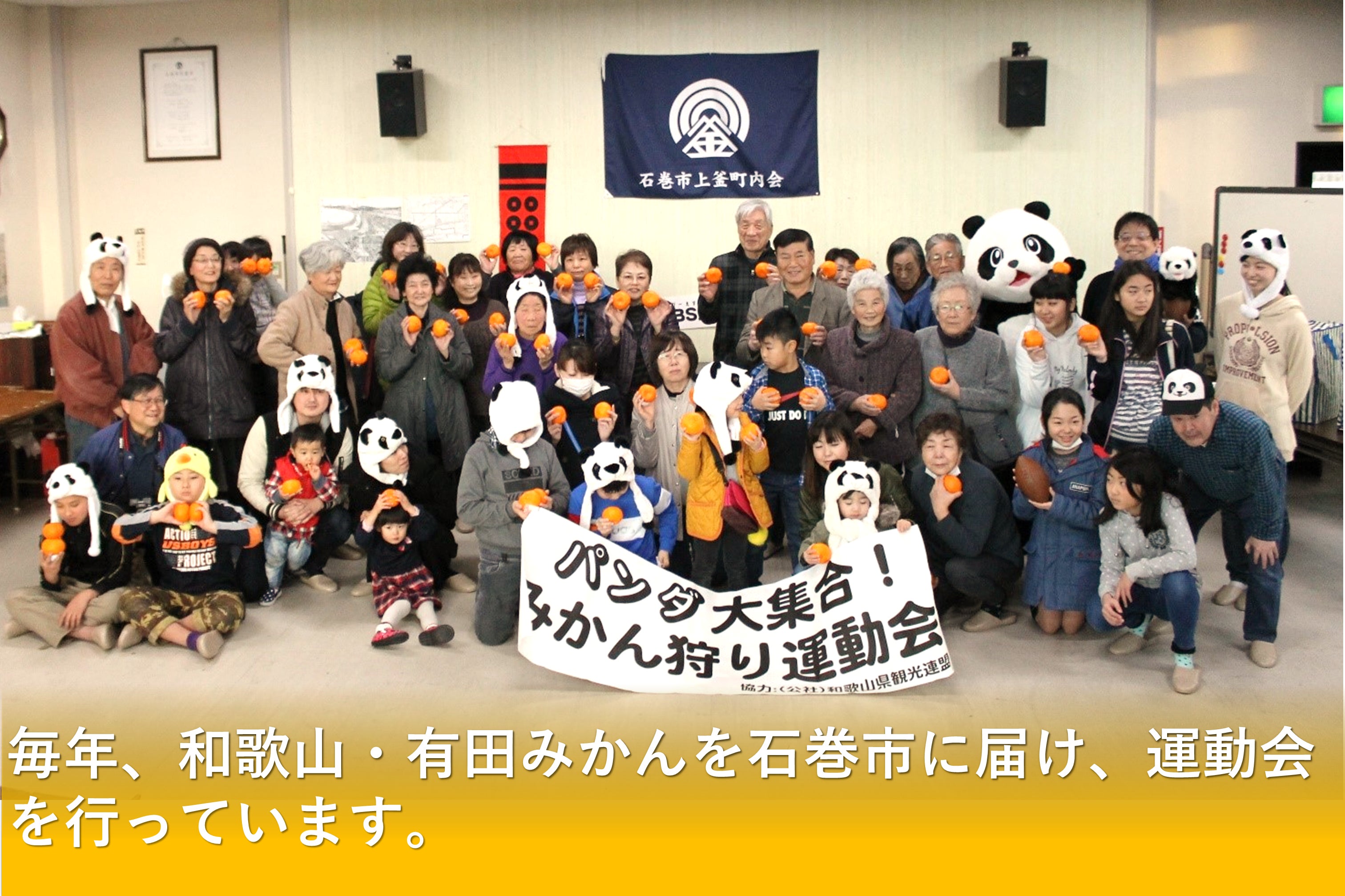 2013年から、仙台にパンダを呼びたいとの話を聞いたので、みかん狩り運動会に和歌山県白浜にいるパンダを取り入れるようになりました。このころから、「パンダ大集合!みかん狩り運動会」という名称となりました。2014年は子どもにパンダを理解してもらうために、日本地図を使って和歌山の場所や、和歌山にはパンダがいることを説明したりもしました。パンダの被り物を使って運動会を行ったり、また、みかんを使ったみかんアートにも取り組みました。石巻市で復興に向けたオブジェ作りをする活動をしている方にも手伝ってもらったりもしました。