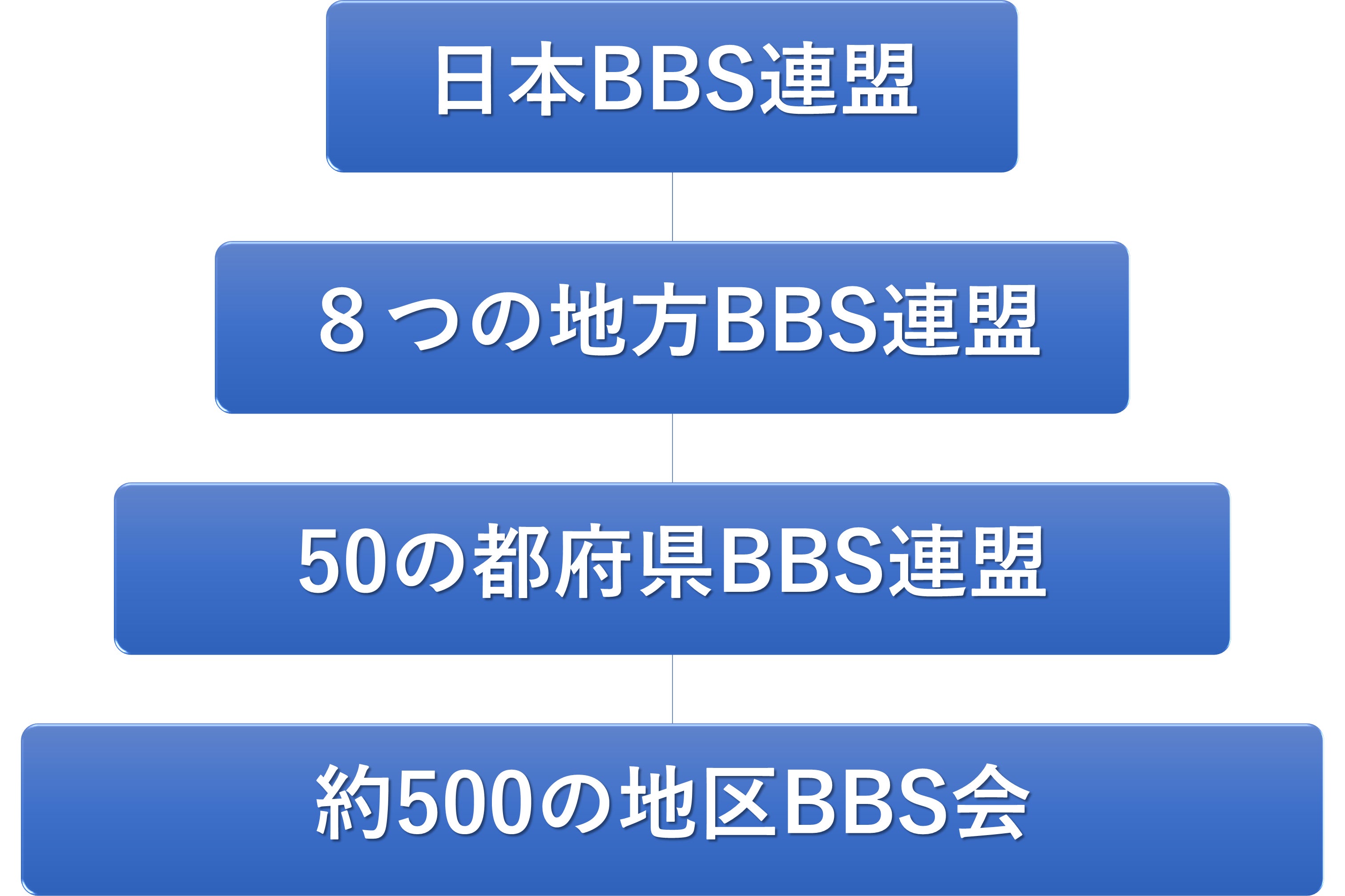 全国に約500の地区BBS会、50の都府県BBS連盟、10の地方BBS連盟から構成され、約4,500名程度の会員からなる組織です。BBSについては、法務省ホームページ*(2)においても紹介されています。