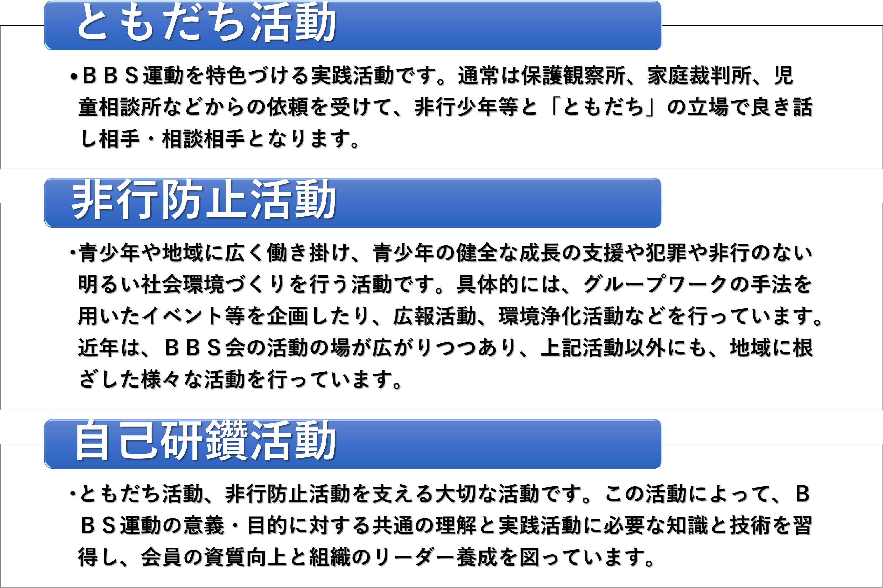 BBSの組織図(日本BBS連盟ホームページ*(3)を基に作成) 具体的な活動として、非行少年・少女や社会不適応の少年・少女に対し、地域の関係機関・団体等と協力し、レクリエーションや家庭教師などその少年に合わせた形で「ともだち」になることを通し、彼ら・彼女らの自立を支援する「ともだち活動」のほか、「非行防止活動」「自己研鑽活動」などを行っています。