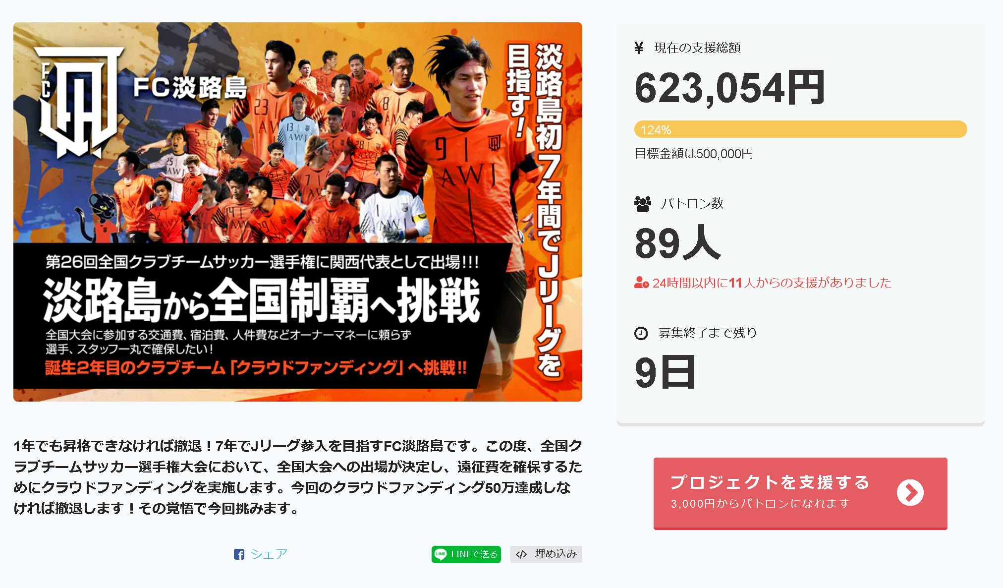 2019/10/23 21:42ご支援・応援いただいたみなさまへこんにちは。この度、FC淡路島初のクラウドファンディング「淡路島発!Jリーグ参入を目指すFC淡路島が全国制覇に挑戦!」が目標金額に達成致しました!クラウドファンディングを公開した初日の支援金額が23,000円で不安だったことを考えると、ここまで多くの方にご支援頂けるとは想像もしていませんでした。現在、クラウドファンディングをスタートしら1週間で100%を超える623,054円のご支援を頂いております。また、みなさんからあたたかいコメントも頂き、選手、スタッフ一同感謝の気持ちでいっぱいです。全国大会の開幕が今週末に迫ってきました。ご支援頂いたみなさんにもいい報告が出来るよう、選手、スタッフ一同、万全の状態で大会へ望みたいと思います。大会期間中の様子は支援者みなさんには限定公開のInstagramにてお届け致しますので大会中もあたたかいご声援をよろしくお願いします。□ホームページhttps://official.fc-awj.com/□Twitterhttps://twitter.com/fcawj_official□Instagramhttps://www.instagram.com/fc_awajishima/ もっと見る