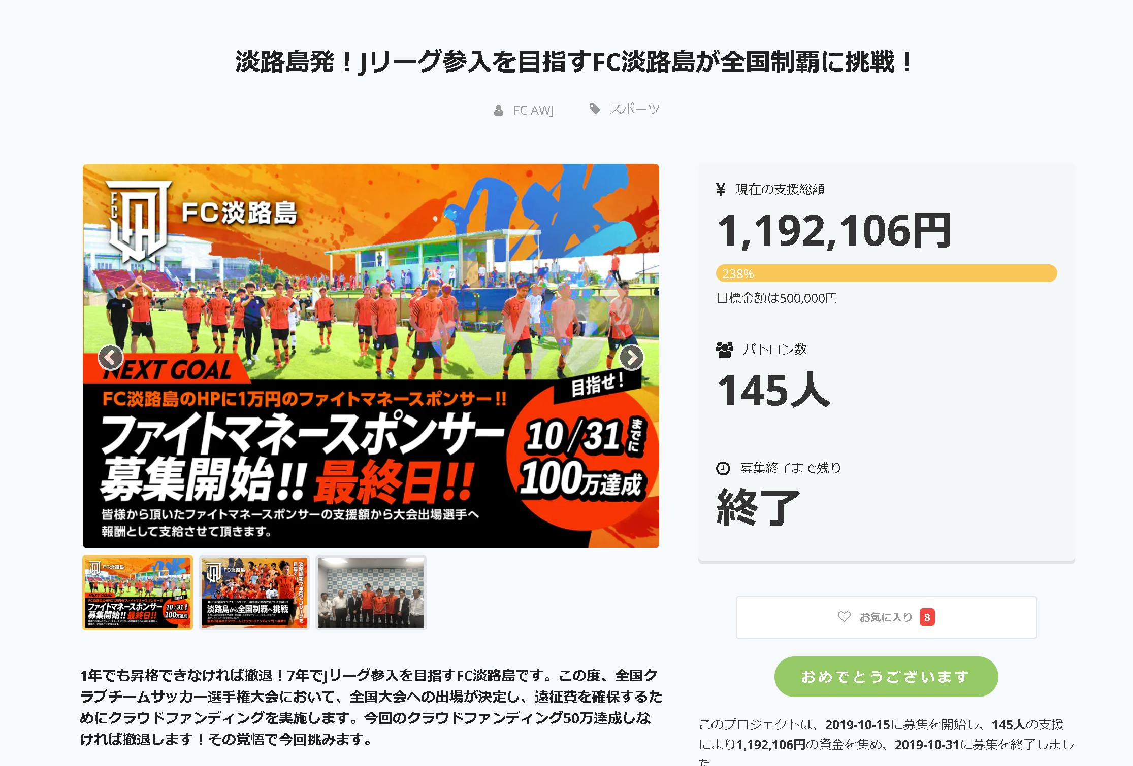 2019/11/02 09:40ご支援・応援いただいたみなさまへこんにちは。この度、FC淡路島クラウドファンディングプロジェクト「淡路島発!Jリーグ参入を目指すFC淡路島が全国制覇に挑戦!」が目標を大幅に達成し、10月31日を以て無事終了いたしました!今回のクラウドファンディングは10/15に募集を開始し、145名の方のご支援により1,192,106円の資金を集め 、目標金額の238%を達成することが出来ました。また、目標としていた全国クラブチーム選手権大会でも優勝という最高の結果で終えることが出来ました。全国大会での優勝という結果は、たくさんの方からのご支援やあたたかいご声援があったからこそ戦い抜くことでき、みなさんと共に勝ち取った優勝だと感じています。現在ご支援いただいたみなさんにリターンをお送りする準備を行っております。リターンのお届けは、11月下旬を予定しております。ご支援者様によっては、12月までずれ込む可能性があります。大変恐縮ですが、今しばらくお待ちいただければ幸いです。改めてみなさまに、心より御礼申しあげます。本当にありがとうございました!ps.今後もFC淡路島の「7年間負けられない戦い」は続きます。今後のFC淡路島へのあたたかいご声援を頂けると幸いです。 もっと見る