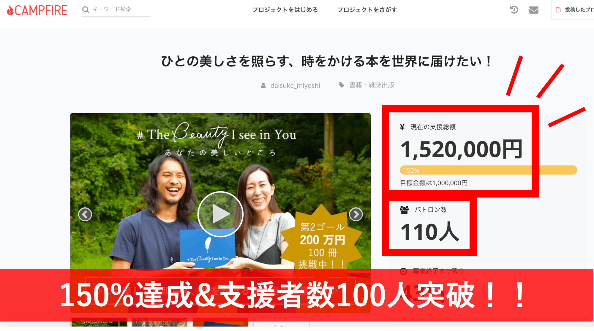 皆さんのご声援のおかげで、開始後9日目にして、ついに 150%(150万円)& 支援者総数 100 人を突破しました!!!(T_T)