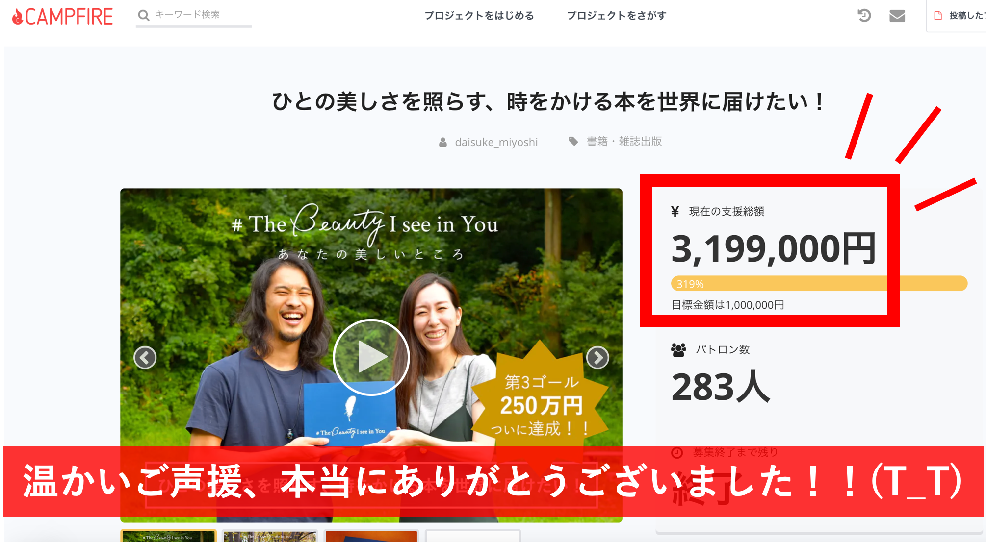 最終金額はなんと 319.9万円...!総勢283人の皆さんにご支援をいただきました。
