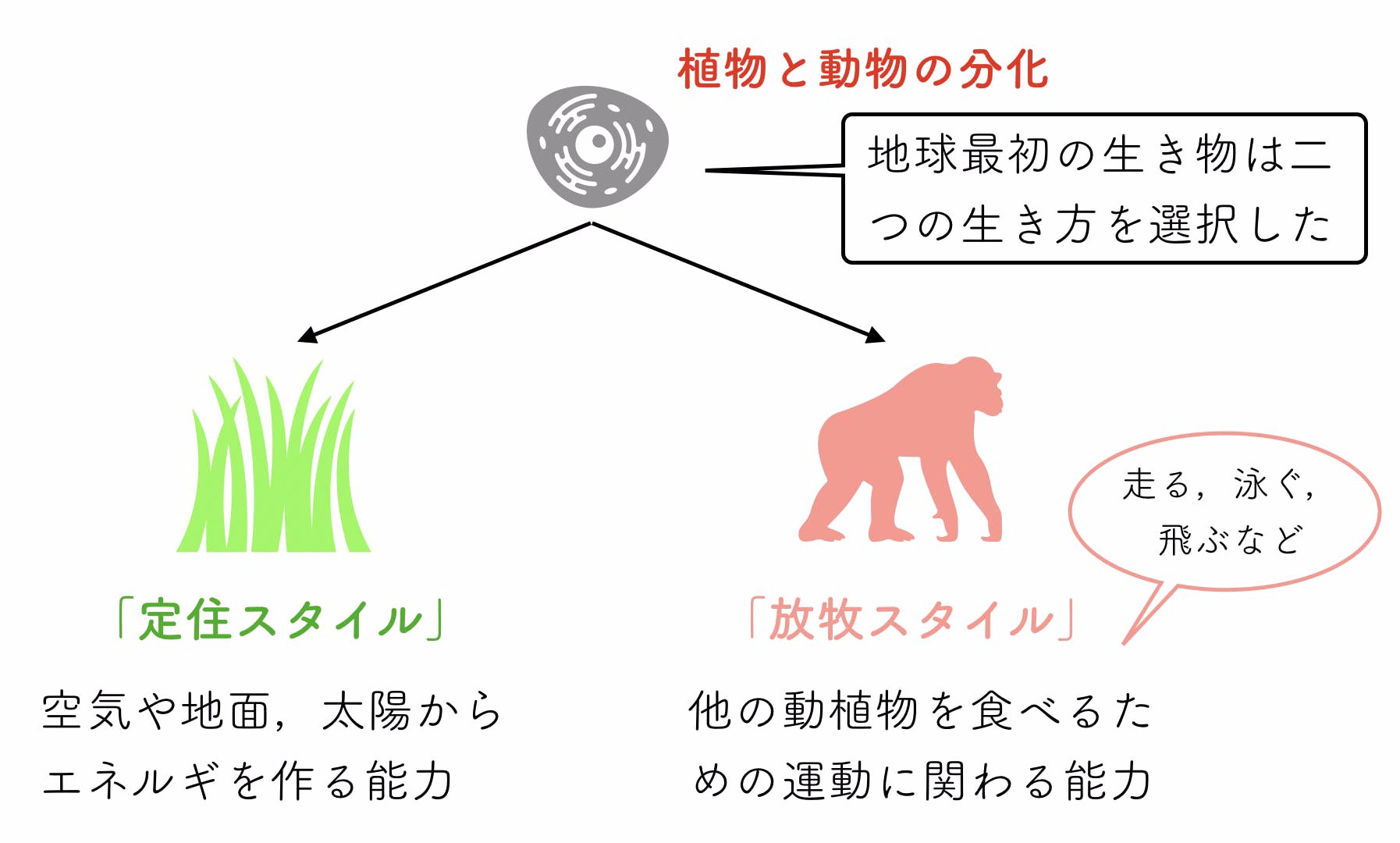 約5億年前,カンブリア爆発が起こり,多様な生物が発生して,現在の植物や動物の祖先にあたる種が誕生しました.生き物は進化の過程で,ある二択を迫られます.
