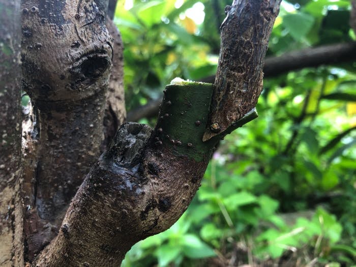 こちらは,接ぎ木ですね!アボカドの木(台木)にアボカドの希少な苗の枝(穂木)を接いでいます.