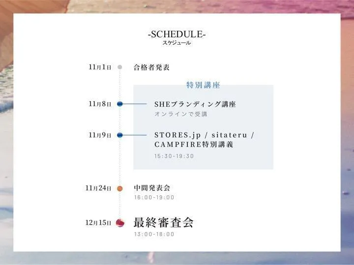 プロジェクトのフロー2次選考では、「SHElikes」で実際に行っている「ブランディングコース(※)」と同じ内容の講義を受けていただくほか、ストアーズ、シタテル、そしてCAMPFIREによる、各社の強みを活かした講義も開催。約1ヵ月かけて、ブランドプロデュース、洋服作り、オンラインショップ運営などのノウハウを学びながら、商品やブランドの構想を練っていきます。