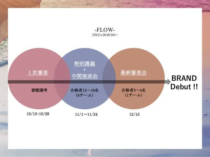 まず応募の際に書いてもらうアイデアをもとに1次選考を行い、12~16名程度に2次選考へ進んでいただきます。2次選考はグループワークを想定しており、4チーム程度でブランド作りを進めていきます。