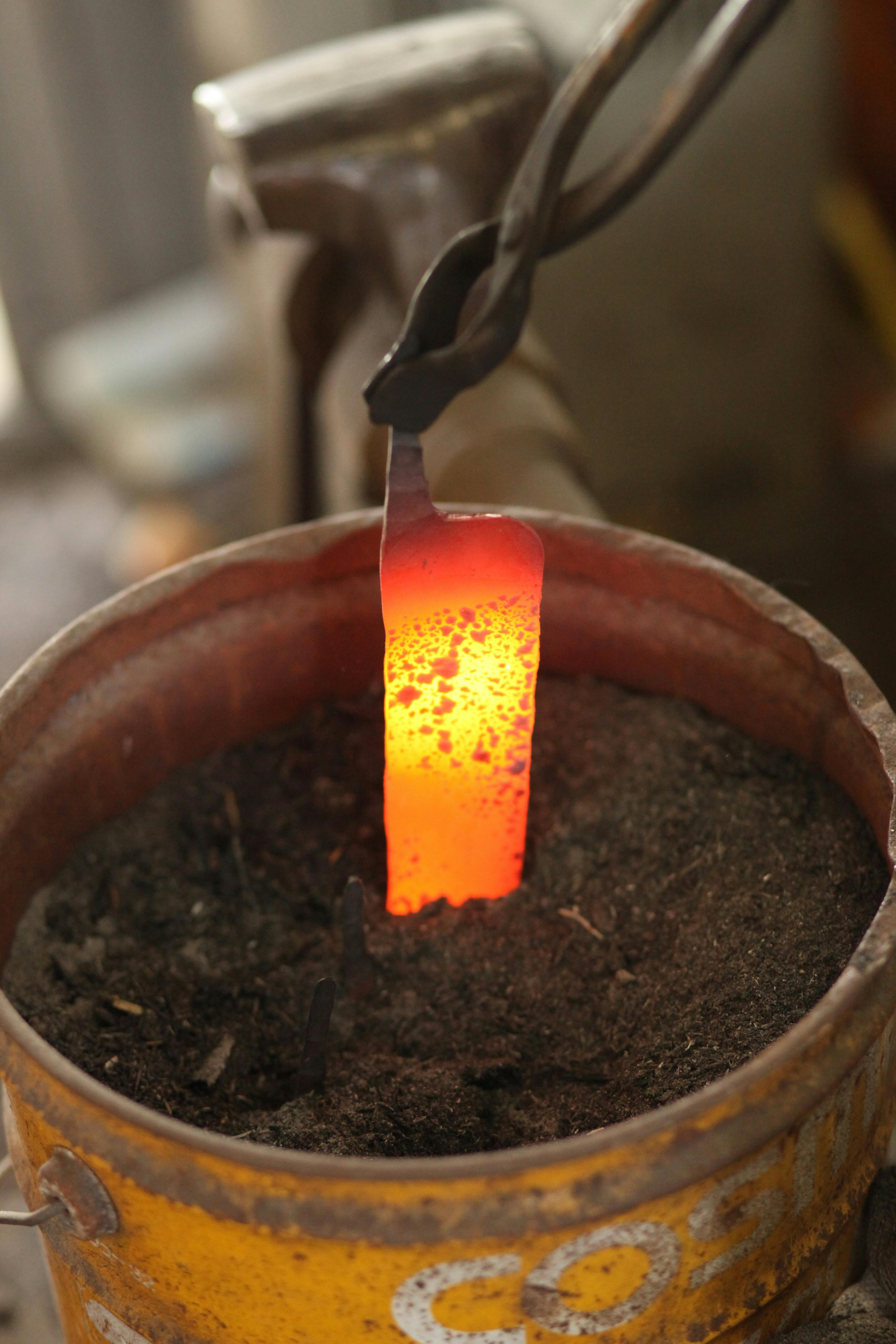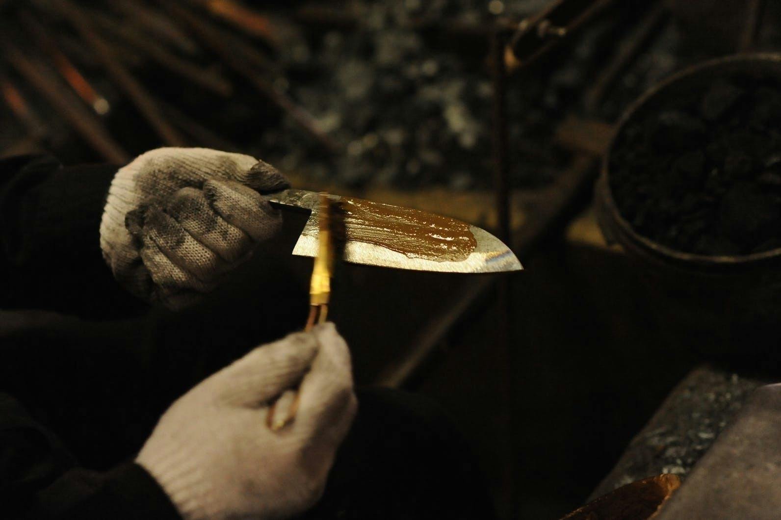 包丁の用途に合わせて、泥塗りしての「水焼き」及び「油焼き」の2つの方法で焼入れを行う。790~830℃の最適な温度までゆっくりと均等加熱した包丁を「水」または「油」に素早く入れ急速に冷却。このとき鋼の組織が引き締まり、非常に硬度の高い構造になる。(写真は泥塗りしての水焼き)焼入れの温度管理は、赤まっている包丁の色具合で行われるため、長年の経験と感が必要である。わずかでもタイミングを損なうと失敗に終わり、鉄クズになってしまうため、まさに「真剣勝負」と言える。