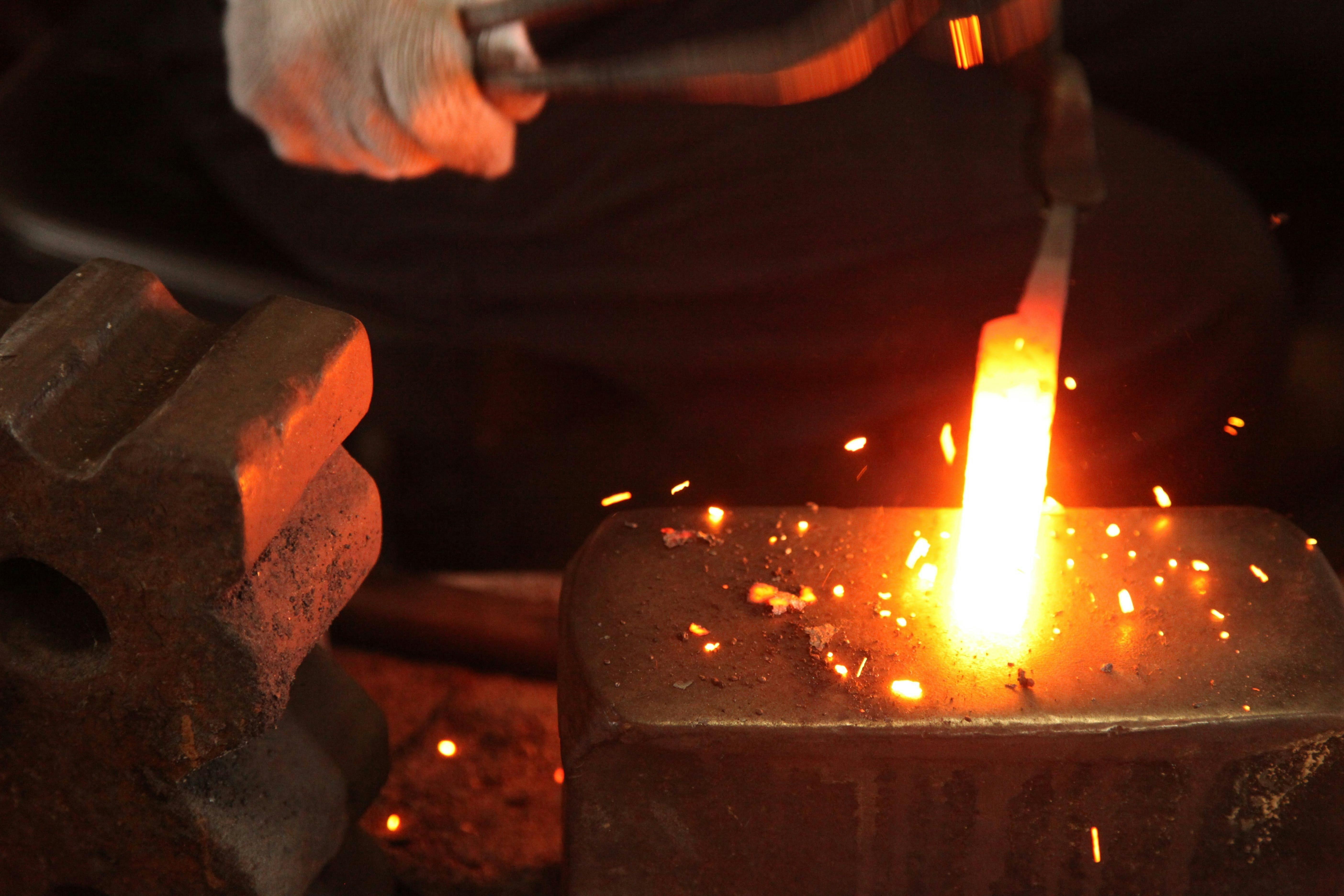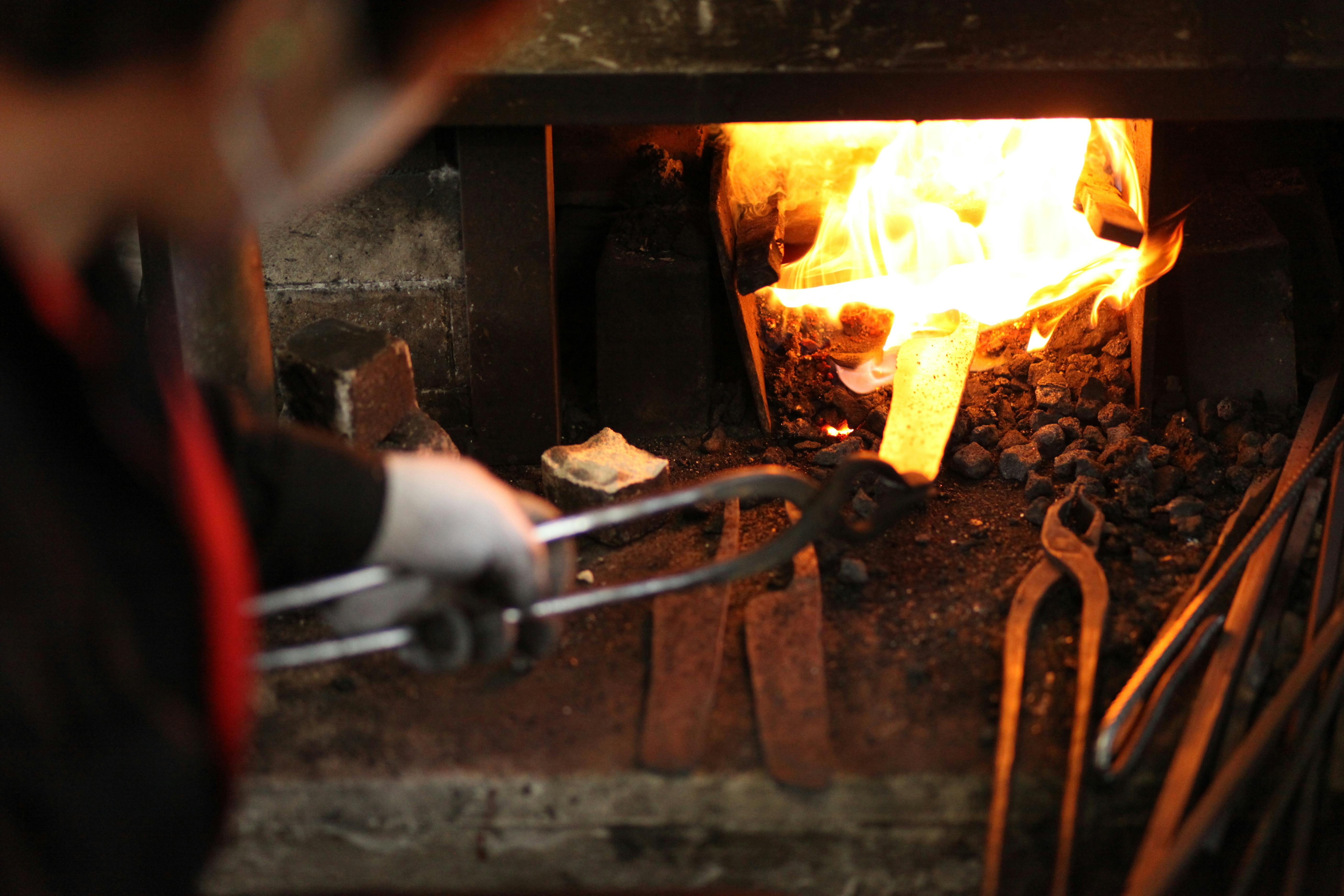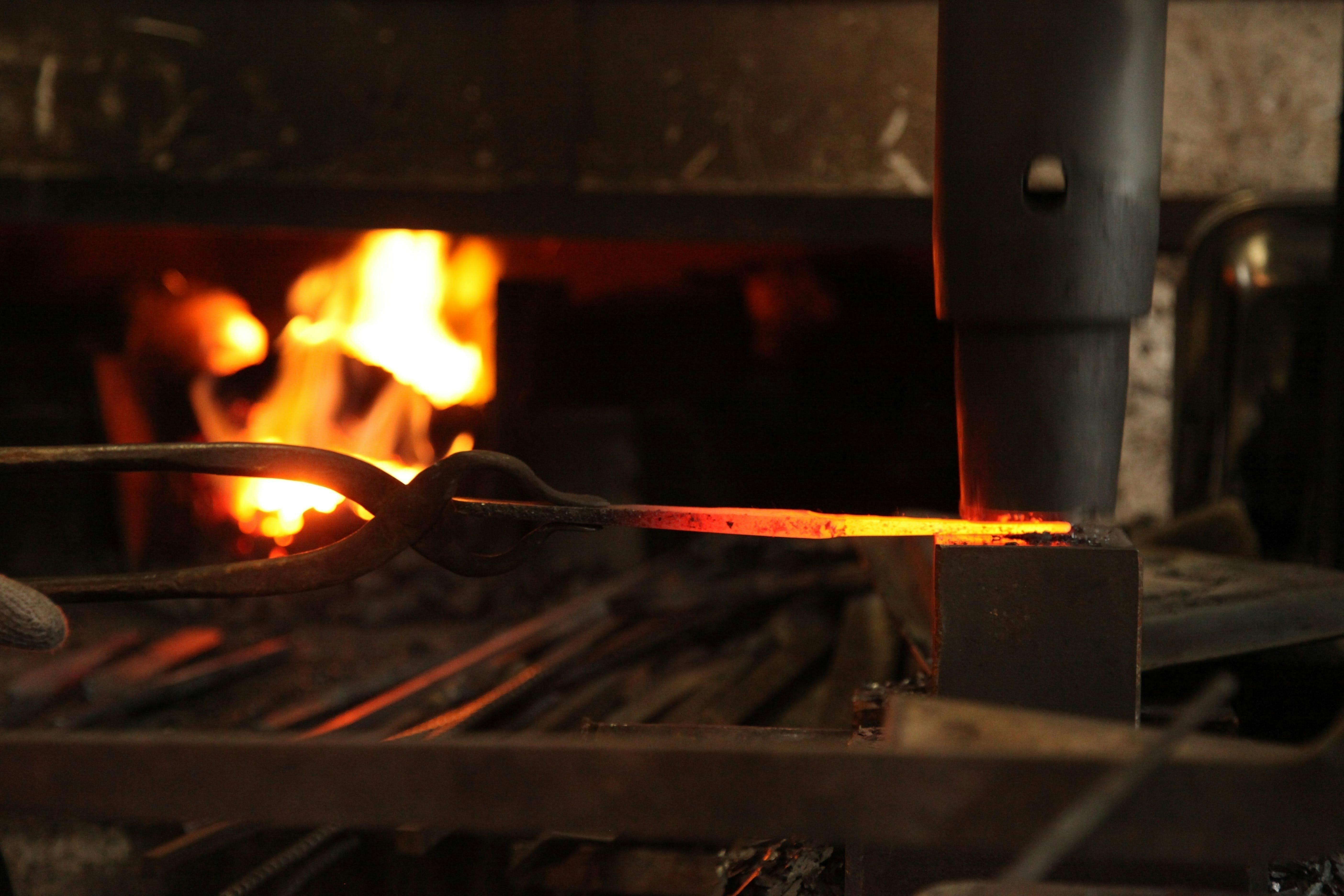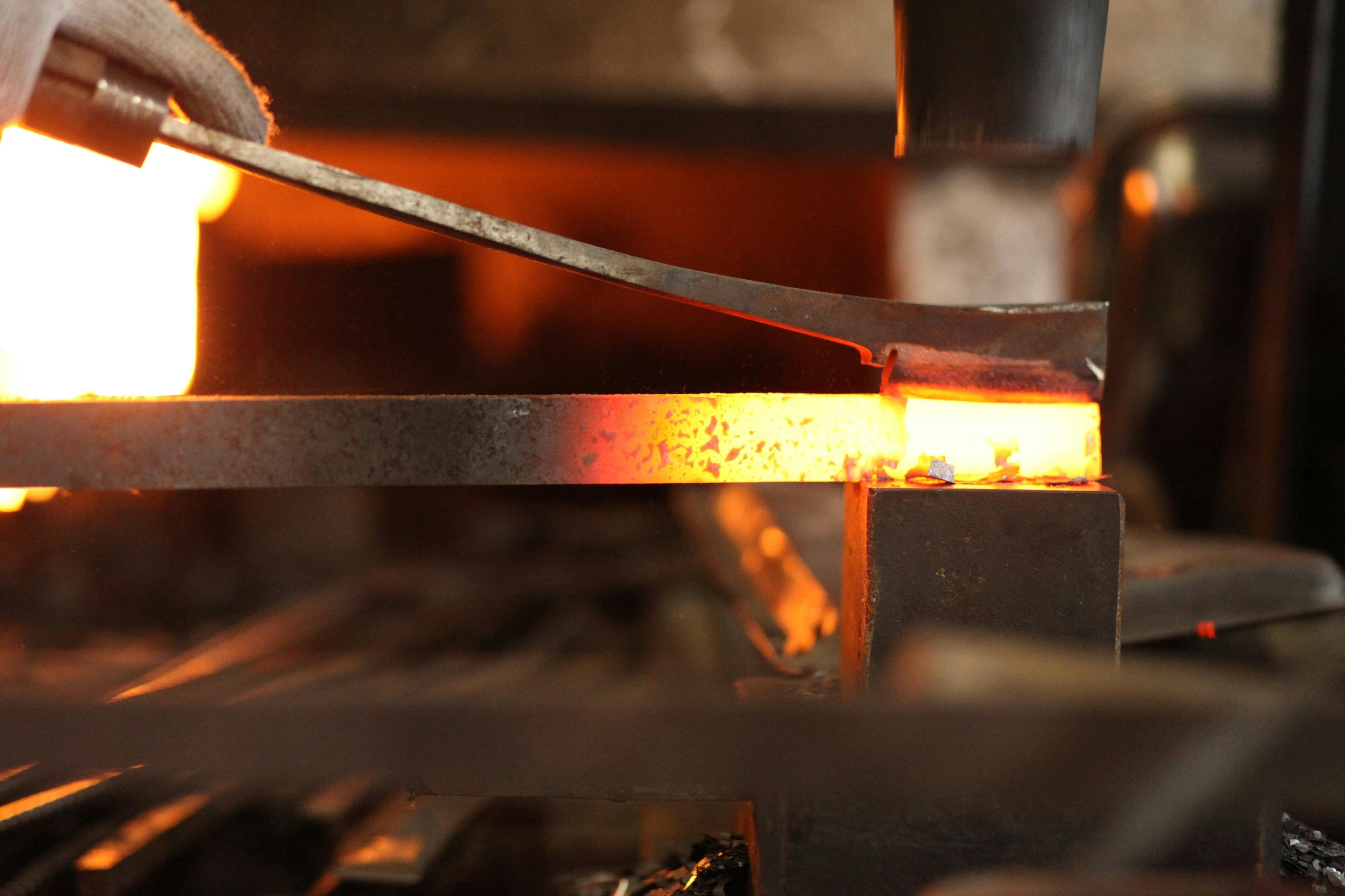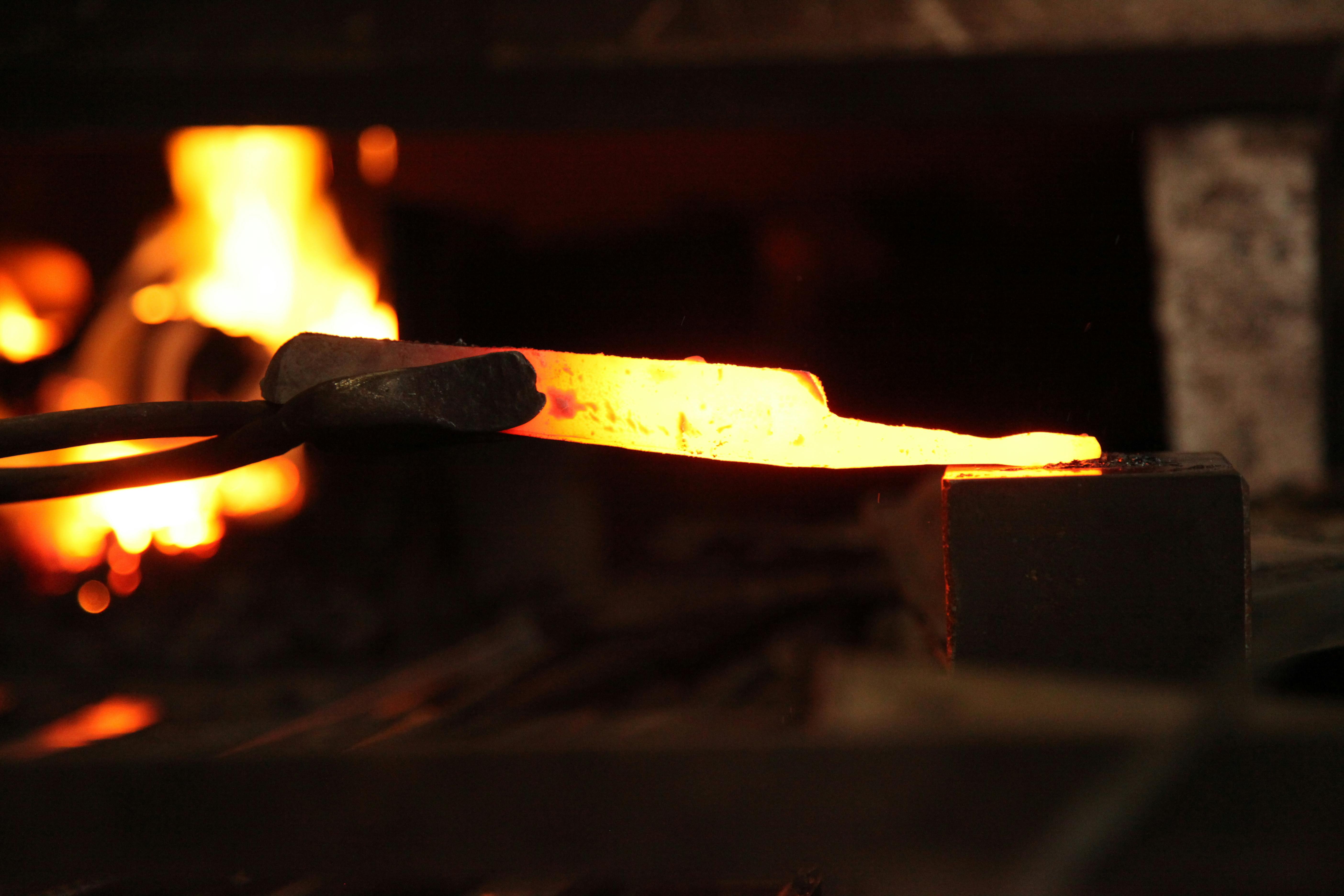 それぞれの刃物用に切り出した材料を加熱し、鍛え上げていく工程を三~四回繰り返し、鋼から炭素が抜けて本来の力が無くなってしまわない内に、素早くハンマーで刃物の形にしていく。