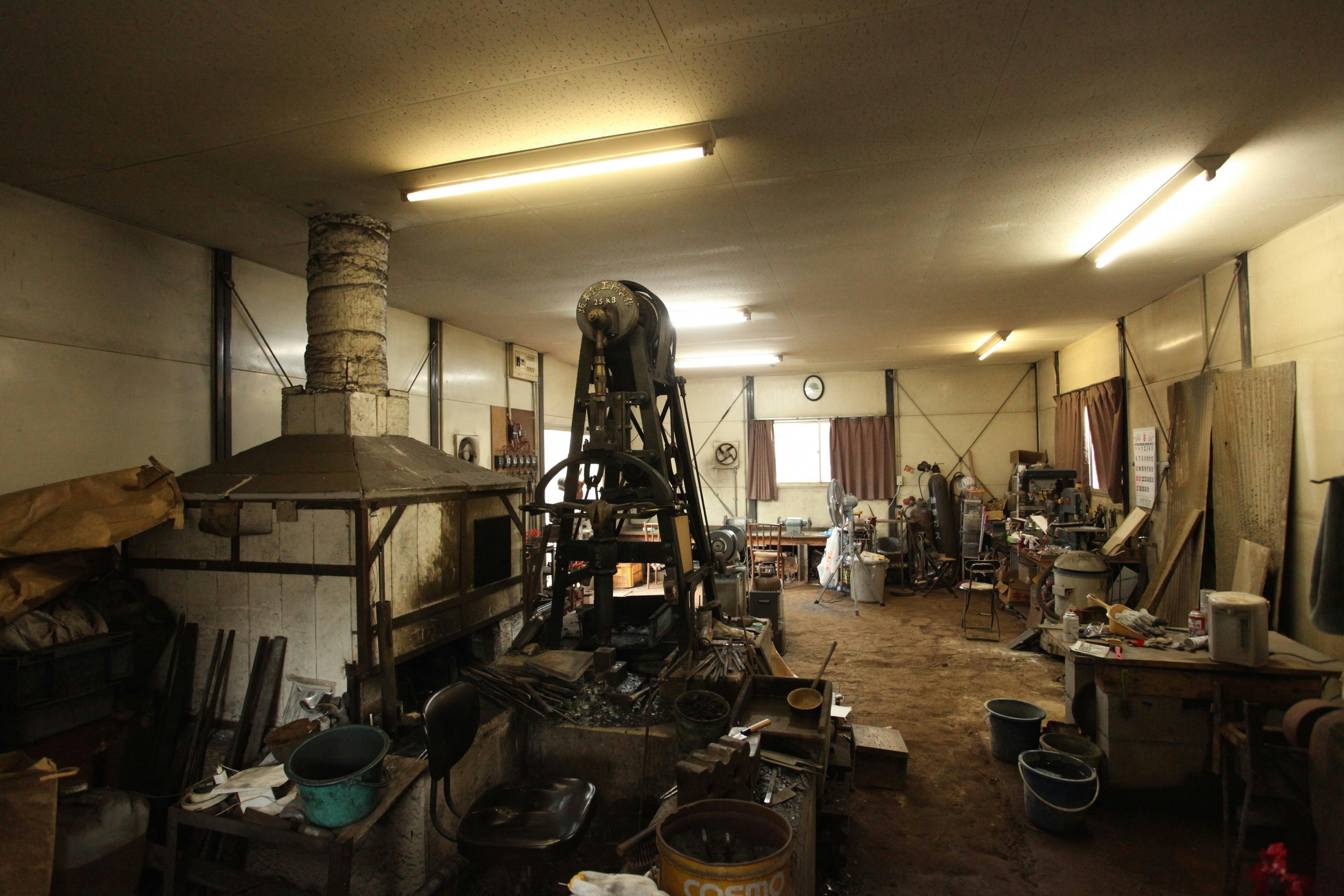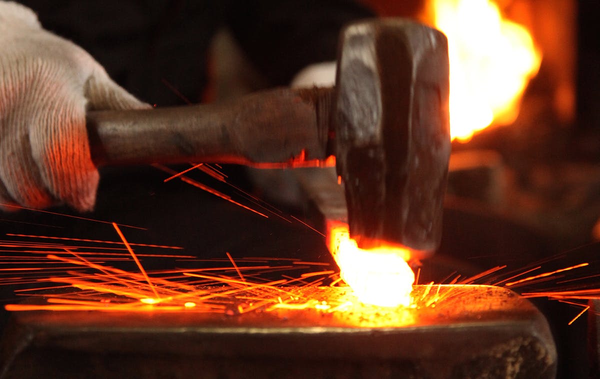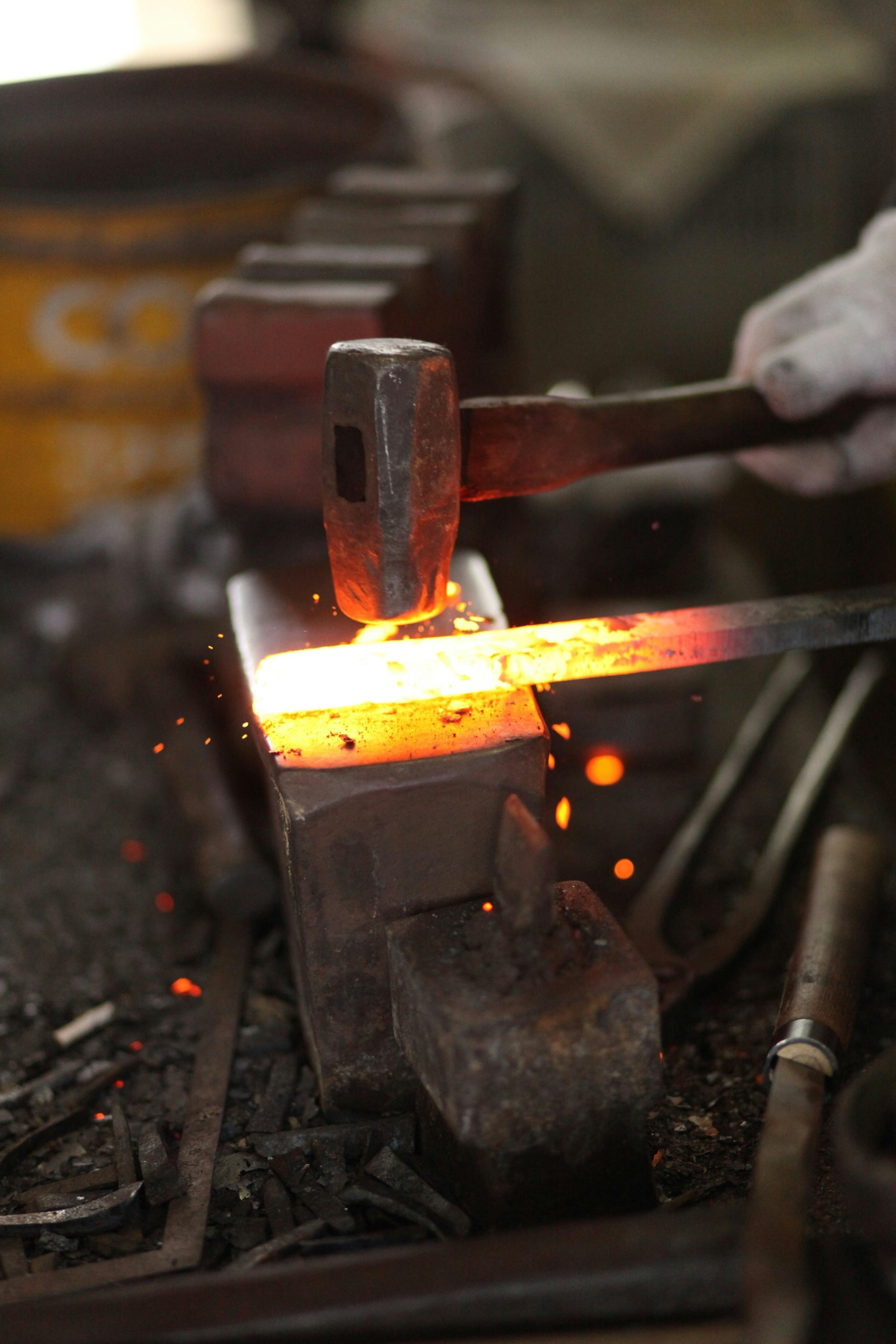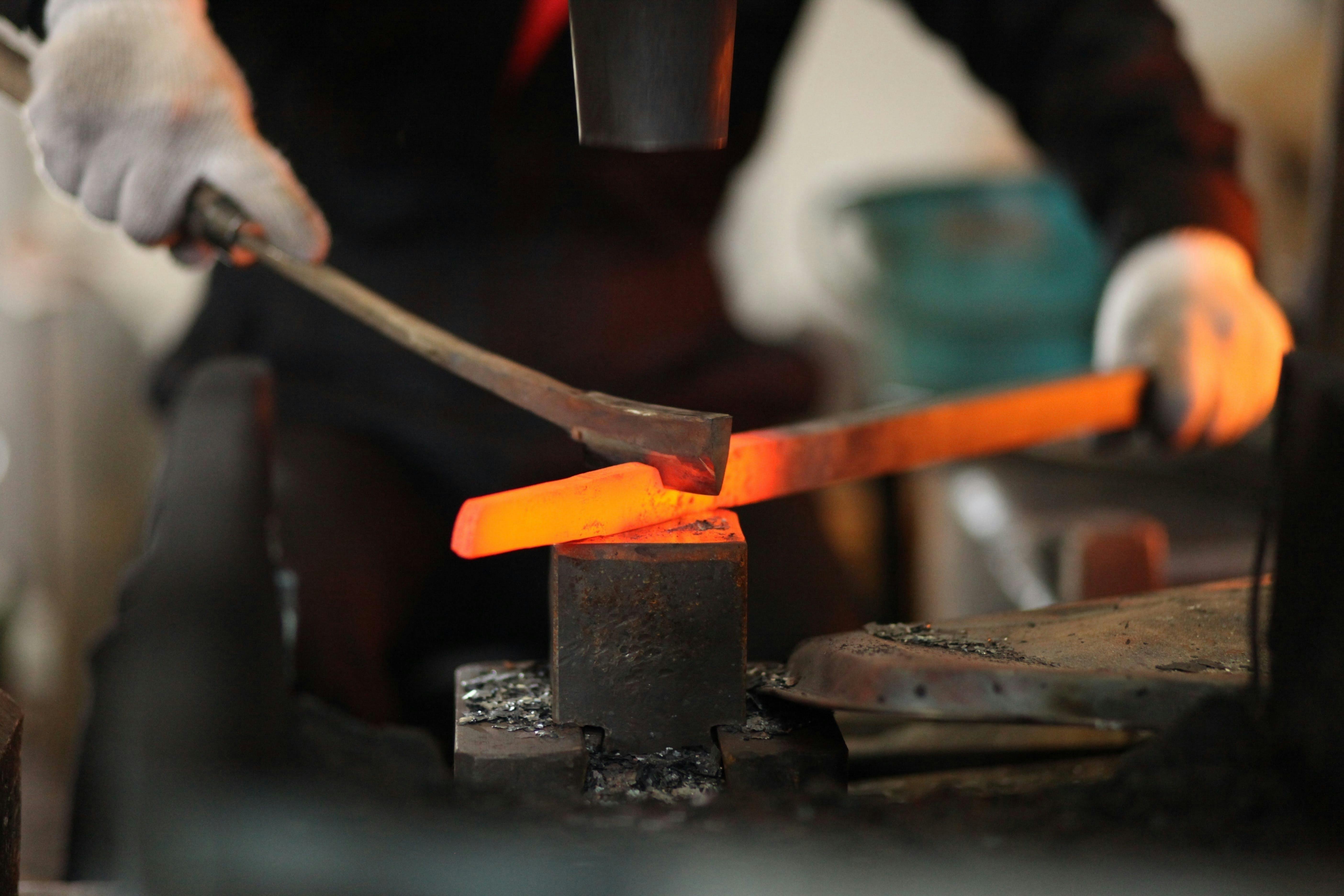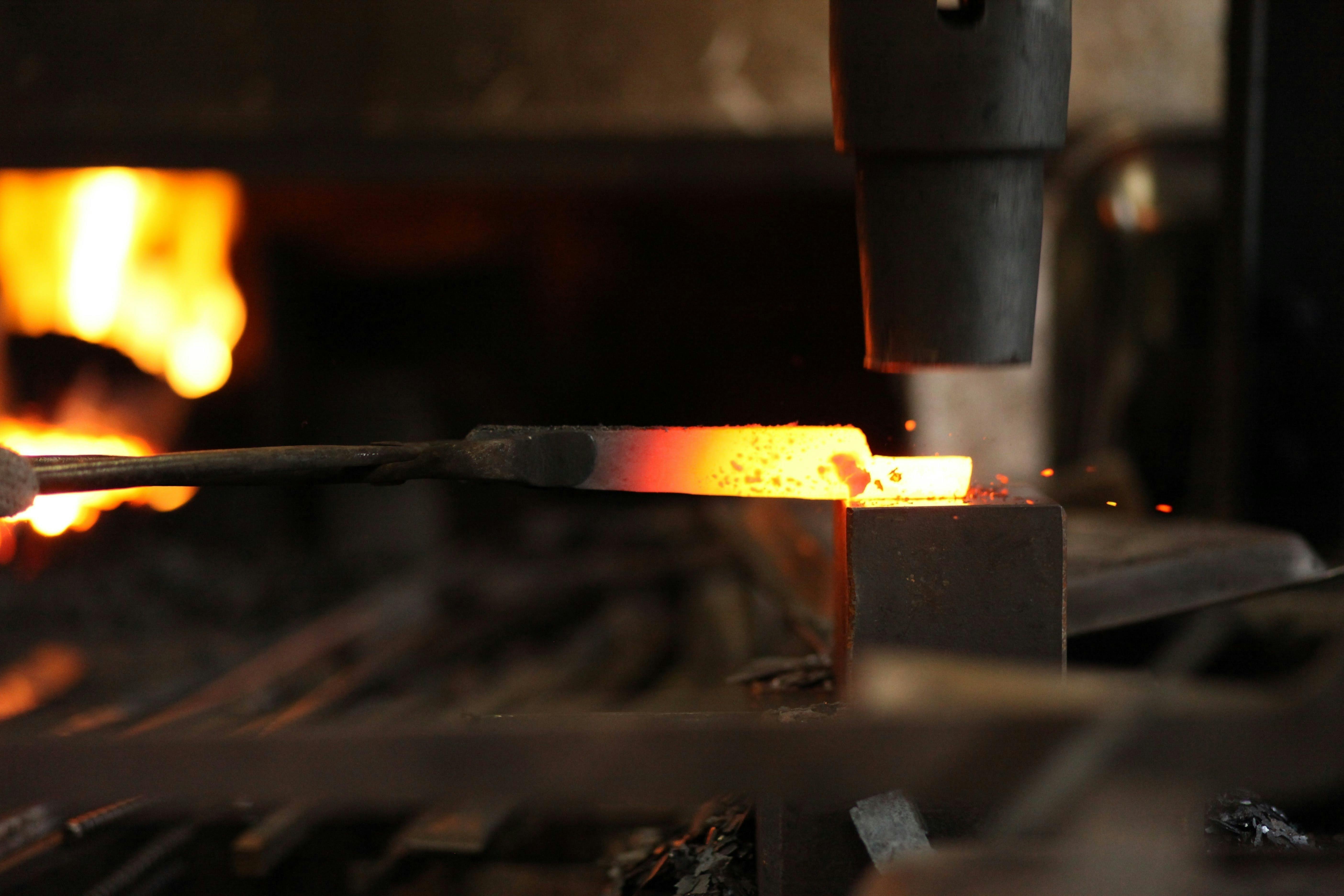 それぞれの刃物用に切り出した材料を加熱し、鍛え上げていく工程を三~四回繰り返し、鋼から炭素が抜けて本来の力が無くなってしまわない内に、素早くハンマーで刃物の形にしていく。