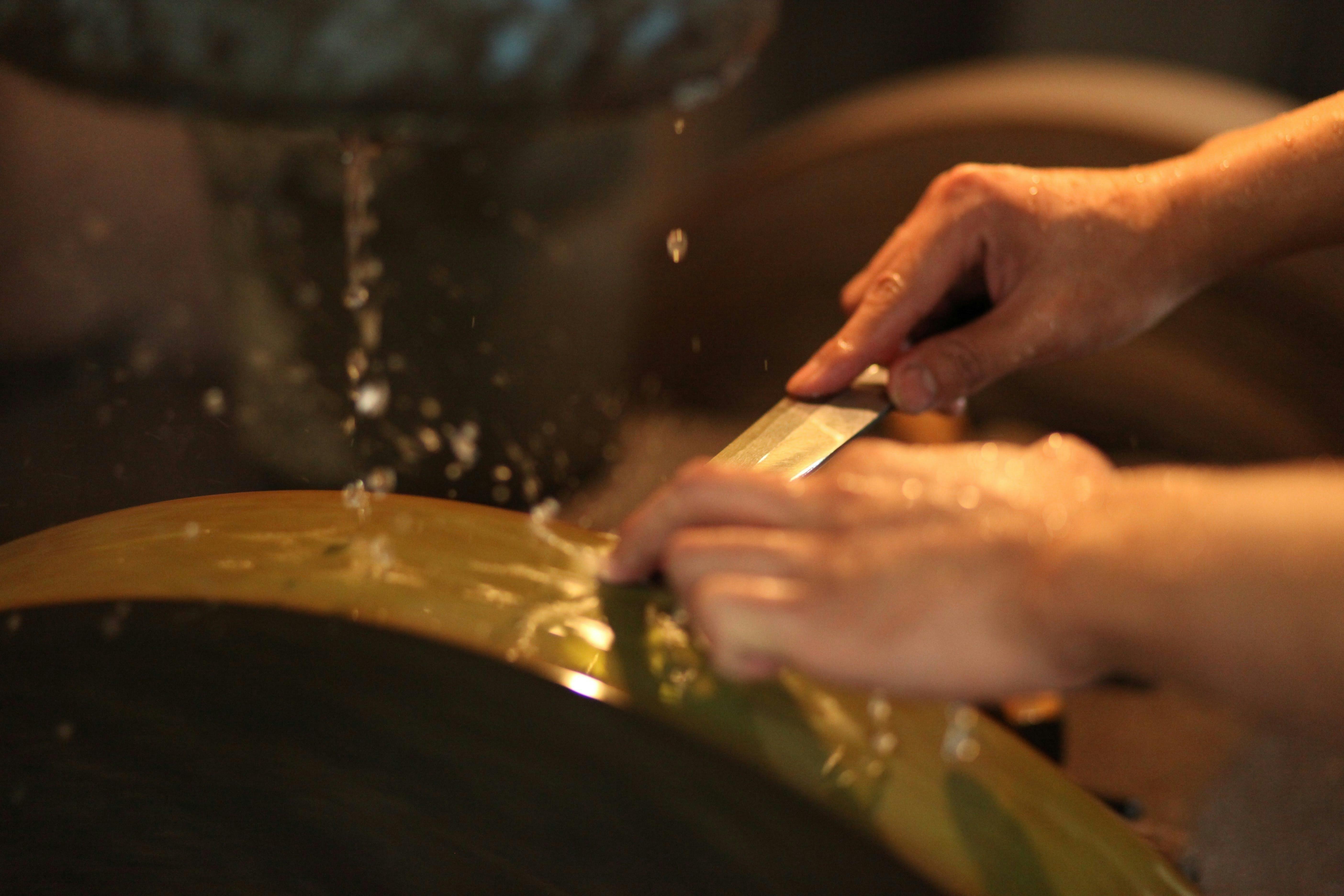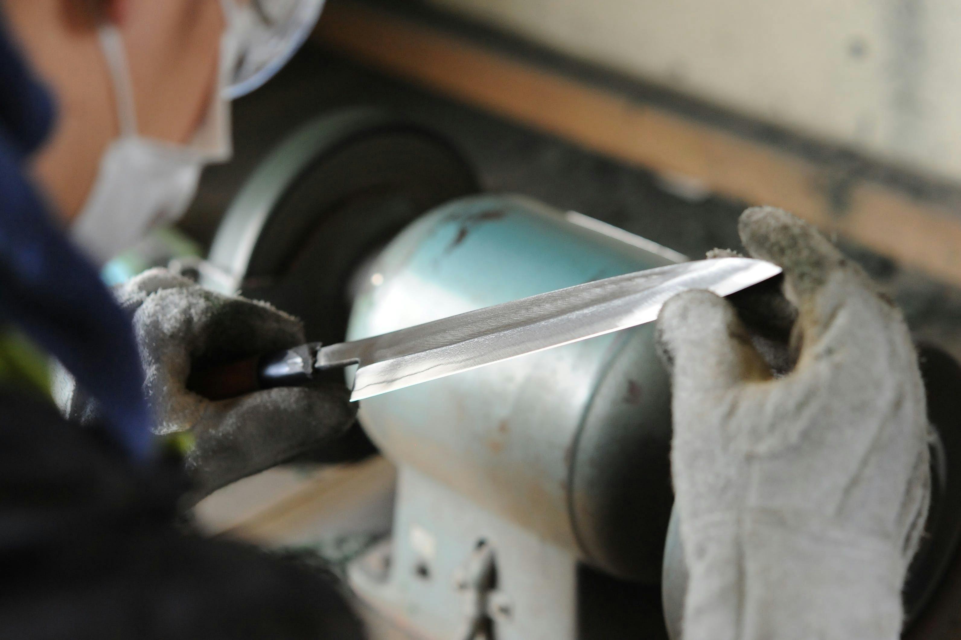 荒研ぎのままではまだ気持ちの良い切れ味ではないため、より目の細かい砥石で丁寧に手研ぎを行い、研ぎ出しした部分の表面をよりシャープに仕上げていく。