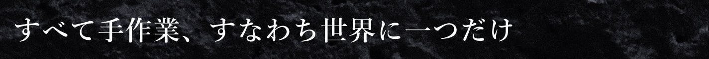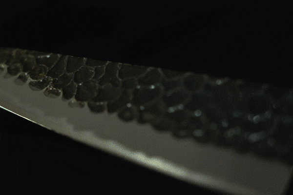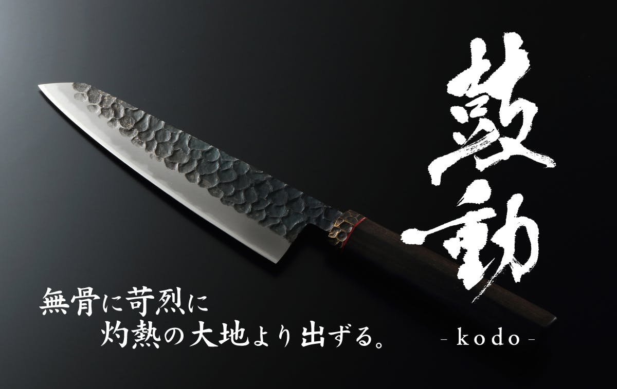 焼入れにより、黒くなった表面を刃の部分のみ削り、刃以外の側面を敢えて黒いまま残した無骨な「黒打ち」仕上げ。日本手打ち刃物の真骨頂とも言えるこの「黒打ち」にさらに特殊な加工を施すことで、誰も見たことのない斬新さと猛々しいフォルムが誕生した。柄には、高級包丁「鼓動」として合いふさわしい「黒檀」を採用している。