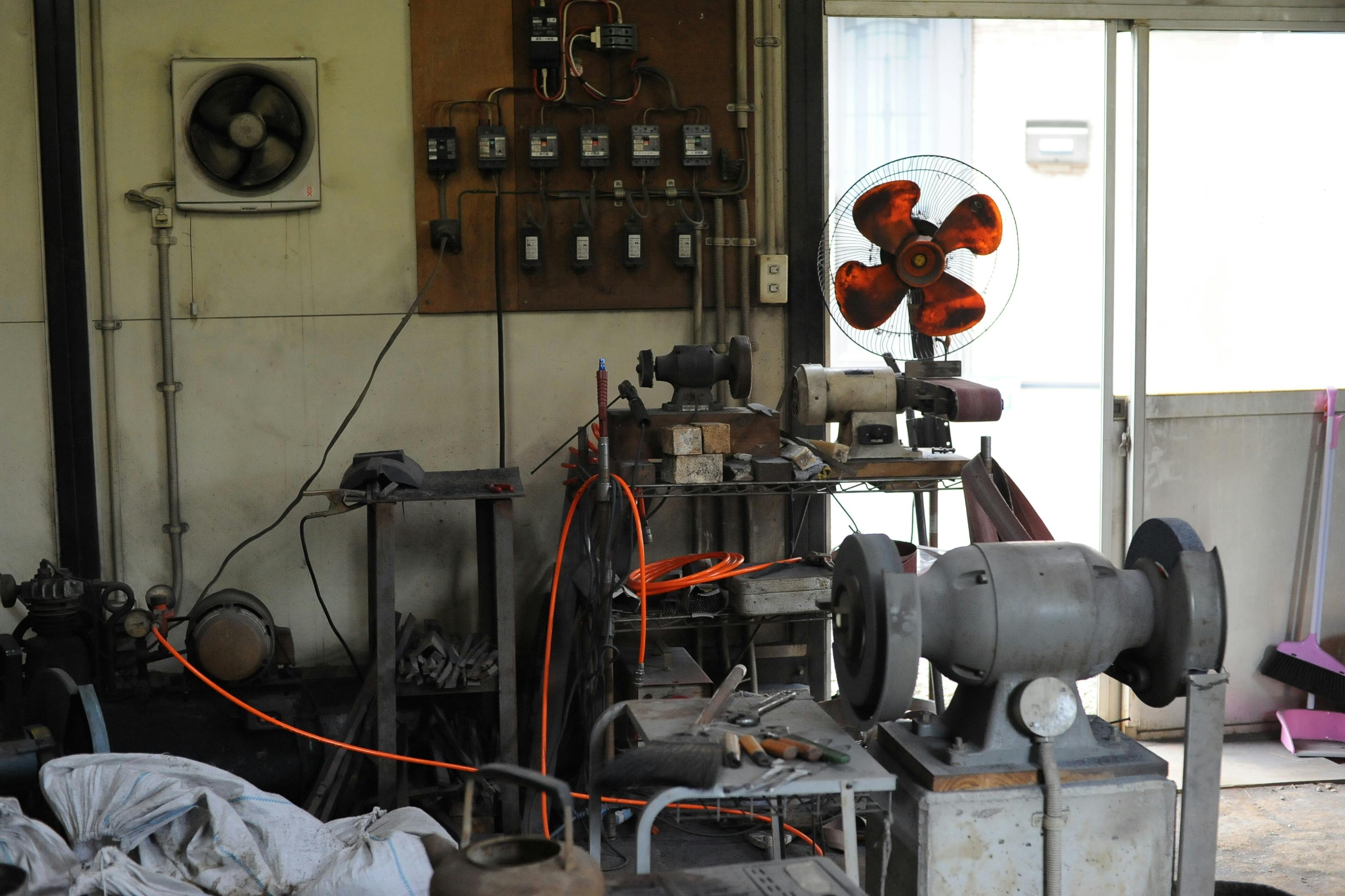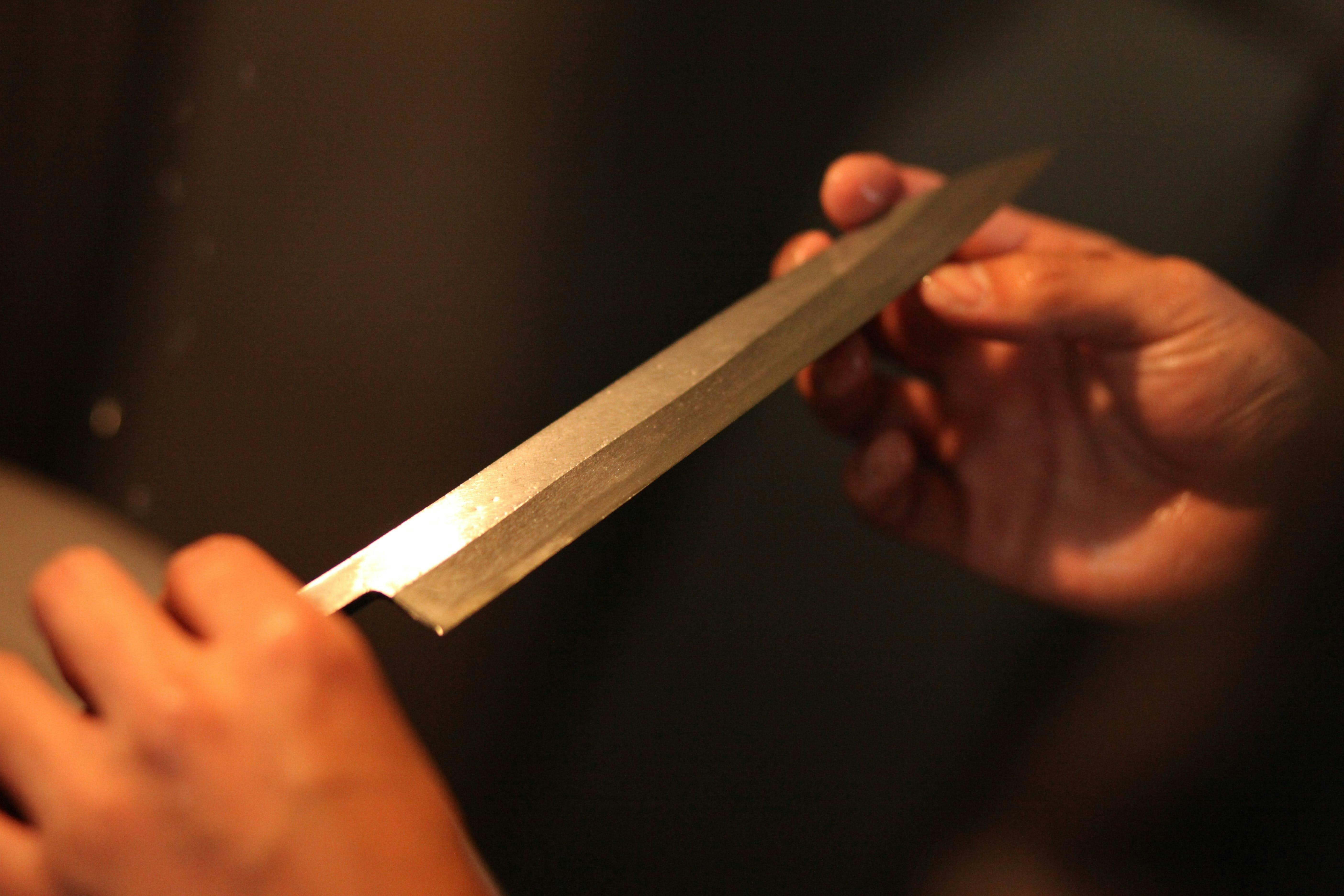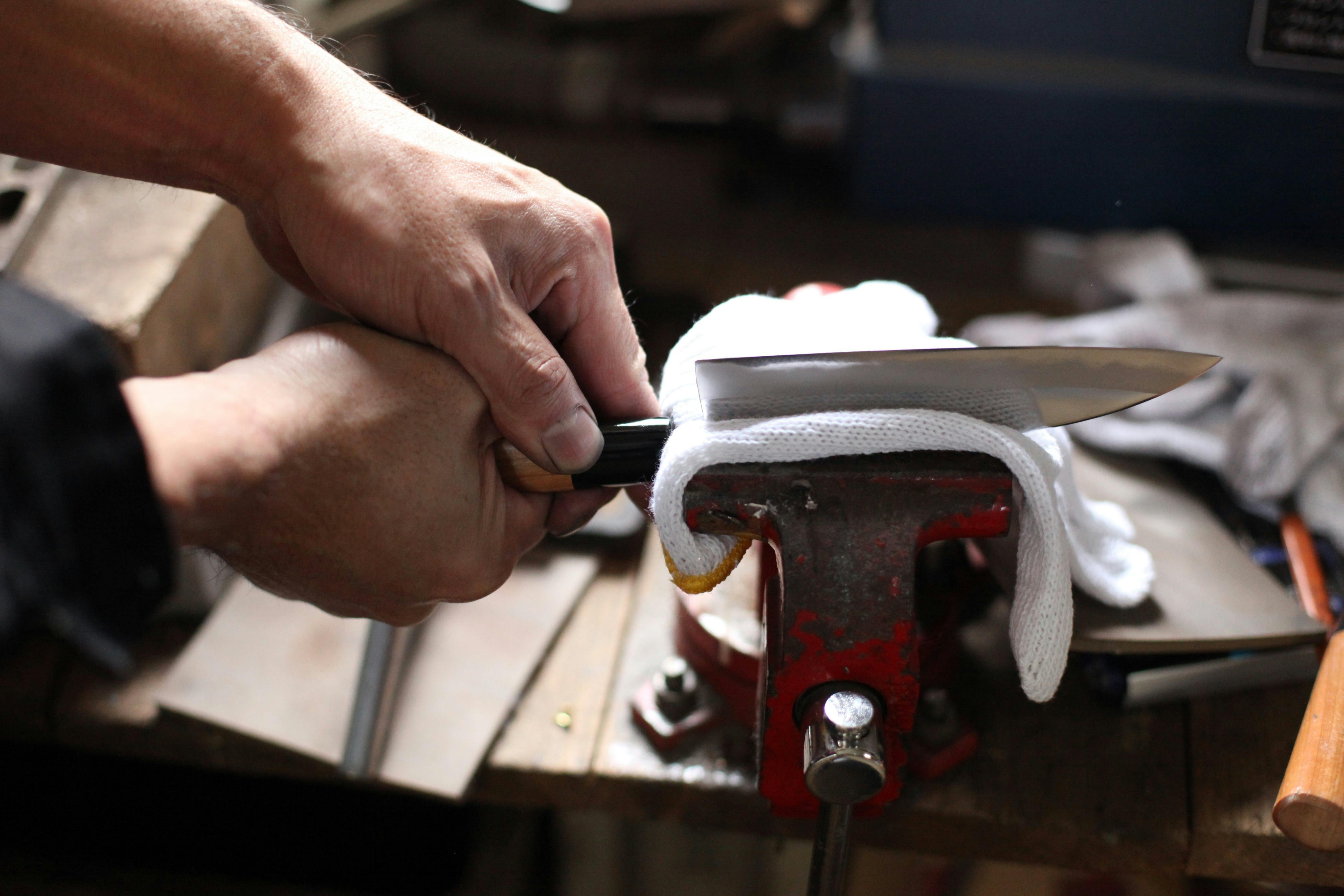 目の粗い砥石で、始めに研ぎ板に包丁を挟み、大まかに鋼を研ぎ出す。それから手に持って、微妙な手先の調節により鋼を均一に研ぎ出す。