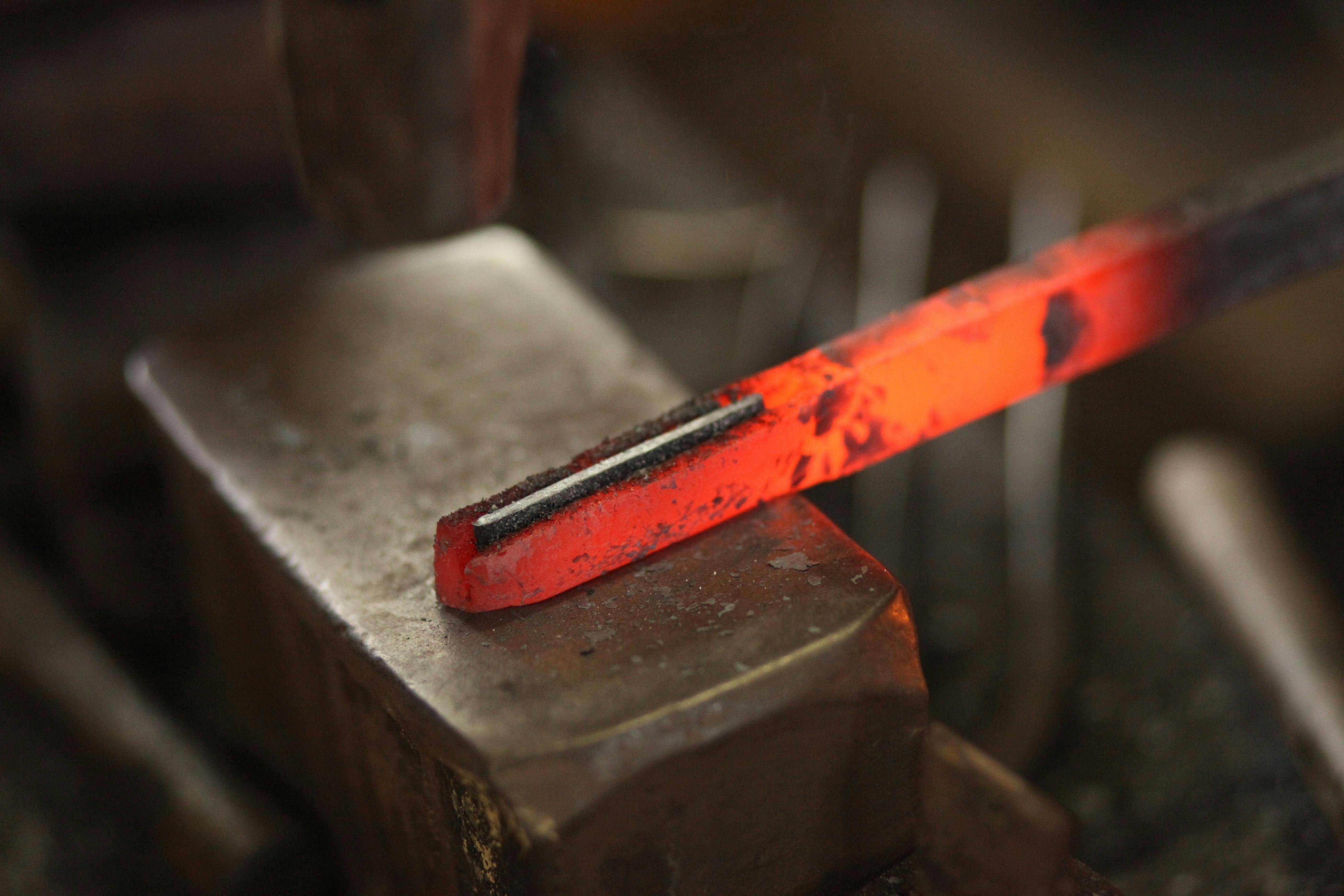 熱した地鉄を割り込み、そこに刃となる鋼をはめ込み、鍛え上げ、地鉄+ハガネ+地鉄の三層構造に。この後、さらに鍛え上げていくことで、それぞれの材料が硬く接合される。