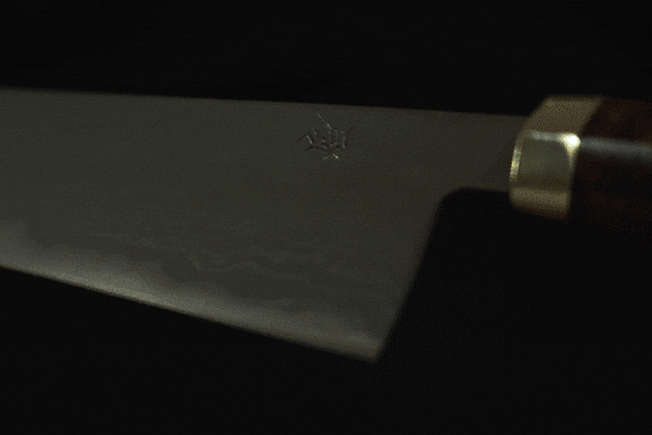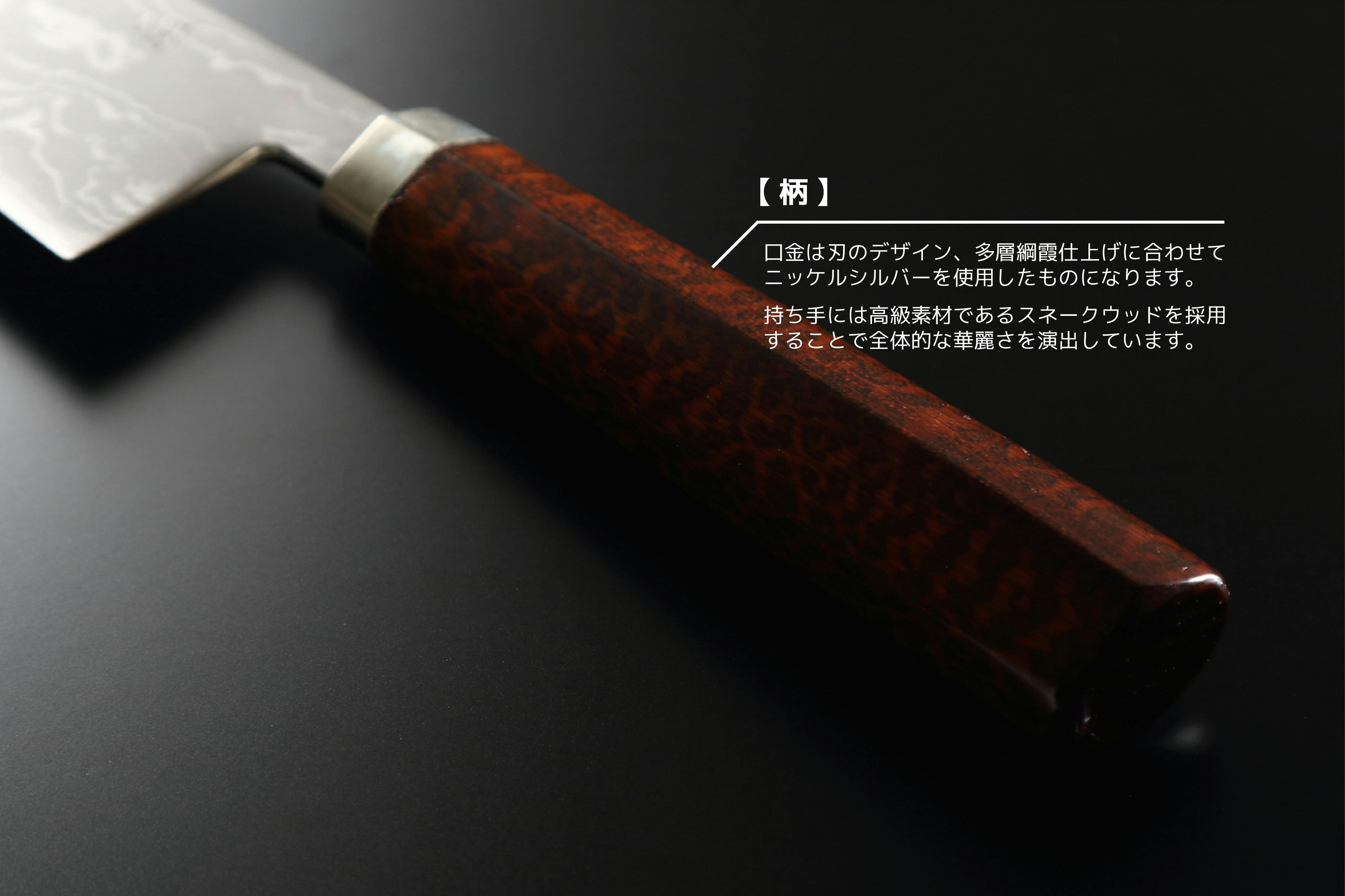 華麗さを放つダマスカス調の模様を浮かび上がらせる多層鋼に白紙1号を割り込み、本鍛造。日本古来の技術と洋のテイストを融合させるべく、ダマスカスのみにとどまらず、柄に高級木材「スネークウッド」を採用することで、スタイリッシュかつラグジュアリーな和包丁がここに生まれた。