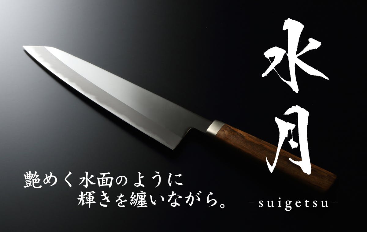 1本1本が職人の手により端正に磨き上げられた、洗練と輝きに満ちたフォルム。握り手も心地よい柄にはボコテを採用。日本古来の伝承製法「本割込み」による圧倒的な切れ味はもちろん、飾り過ぎず、シンプルかつ実用性も高いこの「水月」は、まさに焔ブランドのスタンダードモデルとも言える。