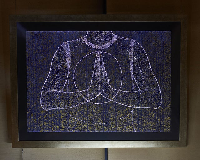 (金墨汁で大量に「ありがとう」と羅列された作品も、部屋を暗くすると....)