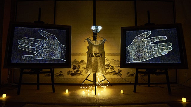 和と宇宙の融合された空間を従来の作品を見て考える行為を辞め、何も考えないで光の絵を見て、心を空にして頂きたいです。