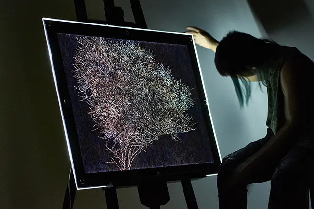 それらは和紙に無数の穴を空け、暗室にて後ろから光らせると左右で絵が変わる