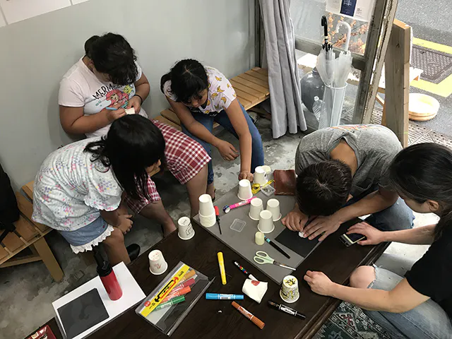(ワークショップでは紙コップに穴を空けるランプシェードを制作して頂きました)