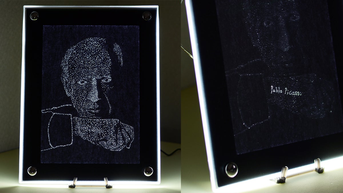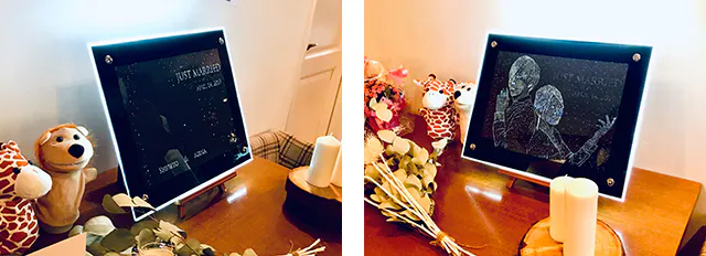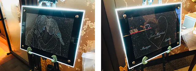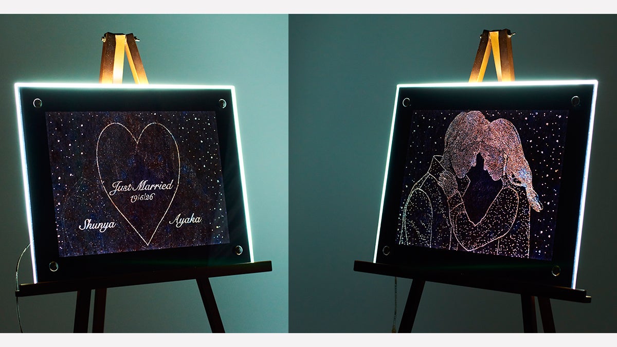 和紙に大量の穴を空け、光る額に入れると暗闇にて星空のアートが浮かび上がります。左右で絵が変わる為、左から見ると人物、右から見ると名前など、1枚の和紙でいろんな楽しみ方ができます。
