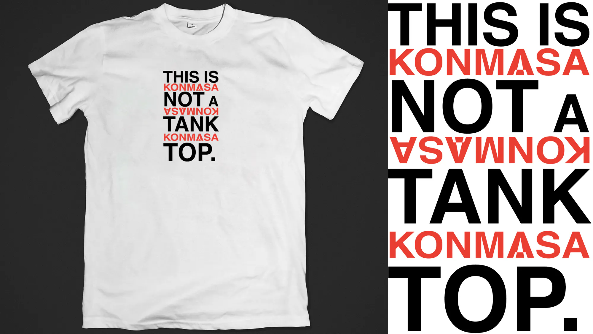 ・常にタンクトップを着ているKONMASAによるデザイン、「THIS IS NOT A TANK TOP.」をTシャツに印刷。こちらはクラウドファンディング限定です。