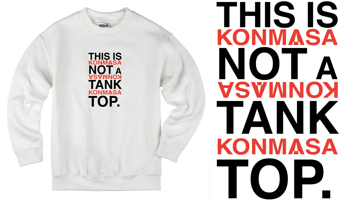 ・常にタンクトップを着ているKONMASAによるデザイン、「THIS IS NOT A TANK TOP.」を白のスウェットに印刷。こちらはクラウドファンディング限定です。