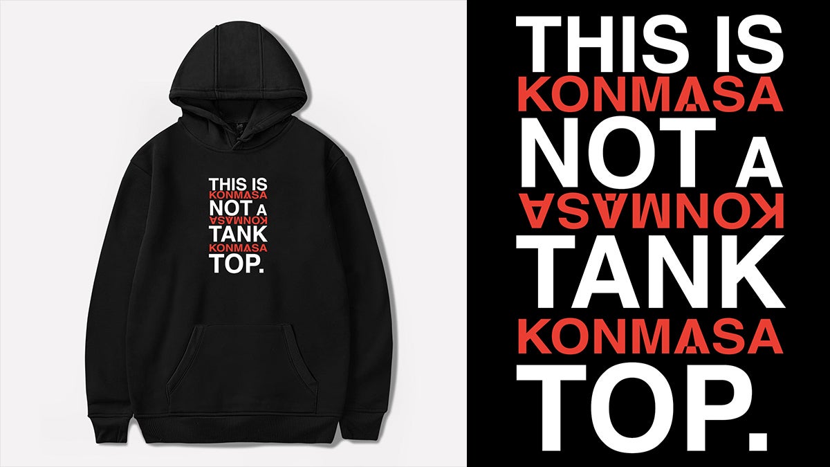・常にタンクトップを着ているKONMASAによるデザイン、「THIS IS NOT A TANK TOP.」を黒のフーディーに印刷。こちらはクラウドファンディング限定です。