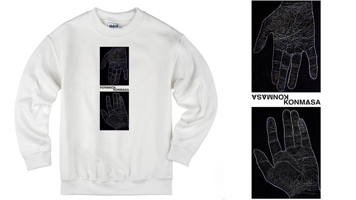 ・KONMASAが自身の手を穴で忠実に再現した作品「掌中天河」。制作の発端は手の皺が細かく多い事がコンプレックスだったが、不思議と眺めているとその流線に銀河の流れを感じ、いつしか愛着を持つ様になったからである。こちらはその作品を本人が撮影し、白のスウェットに印刷したものです。クラウドファンディング限定商品です。