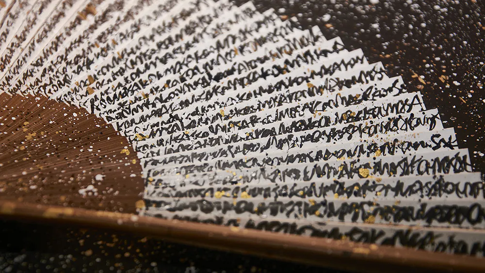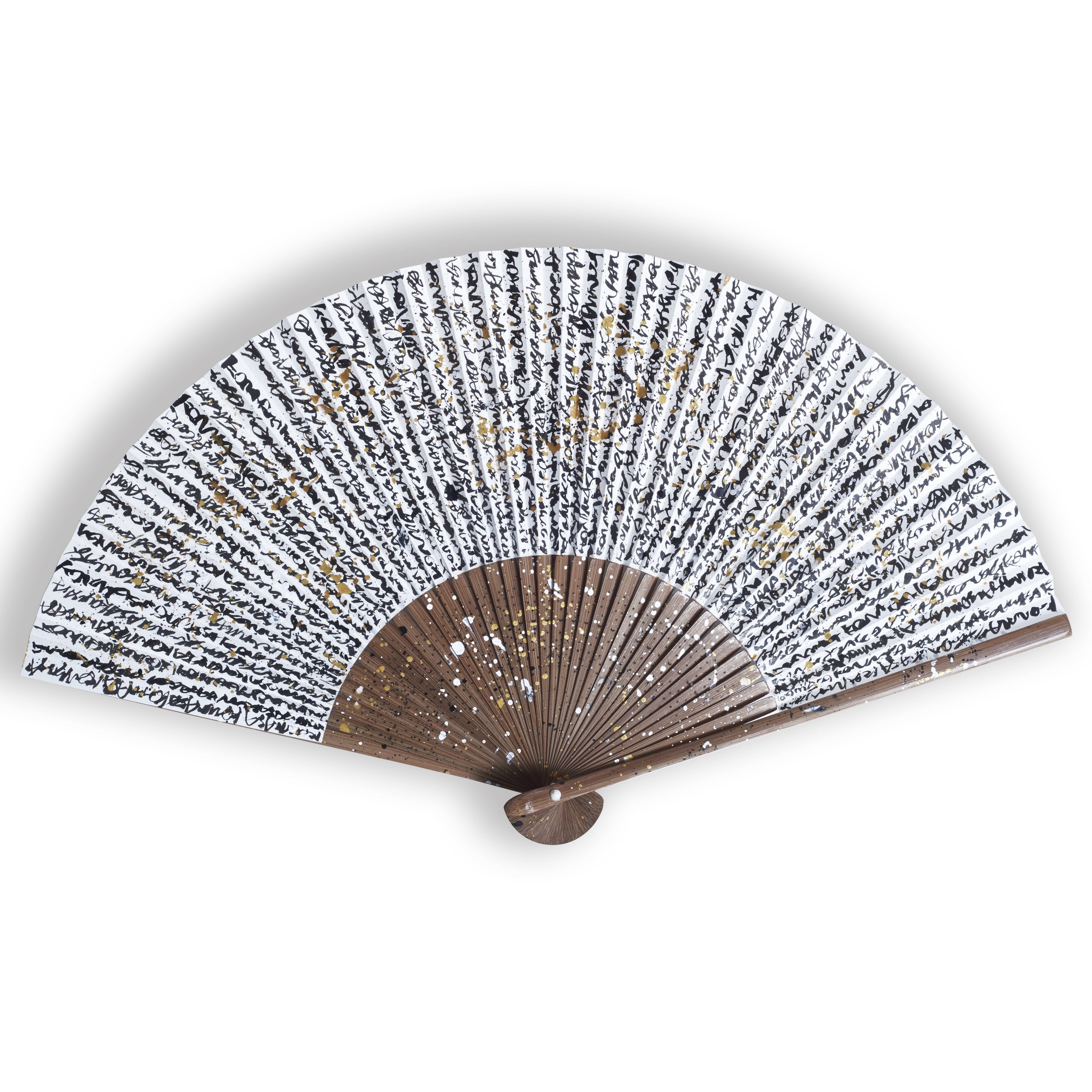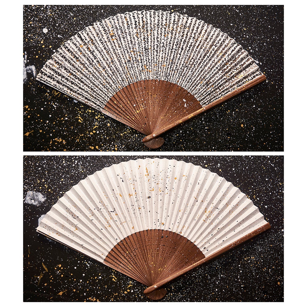 ・こちらの扇子は全てKONMASAの手書きの作品で100本限定です。クラウドファンディングの成功を念じながら表面にひたすらに「KONMASA」と羅列した文字を書き、それらに星を作るように夢中でインクを飛ばした作品です。その制作過程がまるで観音様に救いを求める姿にみえ「扇子観音」と名付けられた。扇子: 7.5寸35間 唐木 (裏面はインク飛ばしのみ)