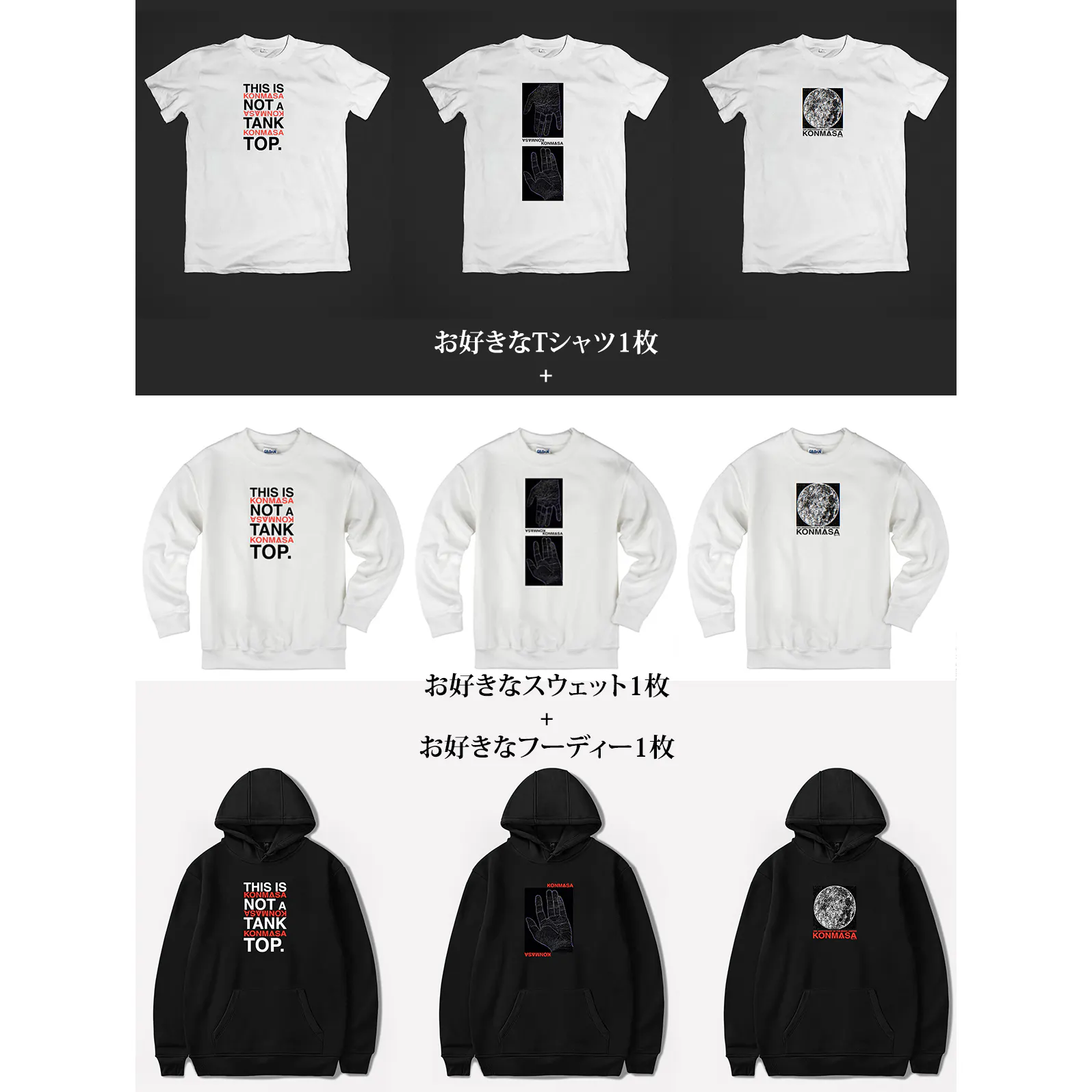*備考欄にて、お好きなTシャツ1枚 + お好きなスウェット1枚 or フーディー1枚 の種類とそれぞれのサイズを記入して下さい。