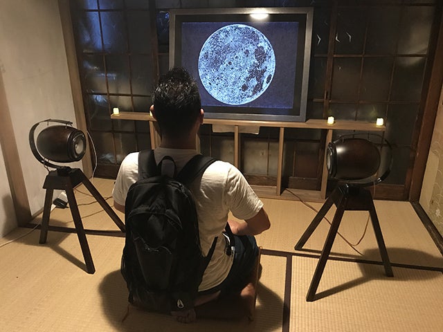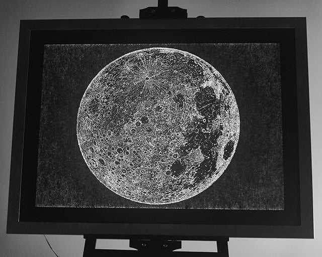 (細かい穴で制作された満月は角度を変えると新月に サイズは1018mmx770mm)