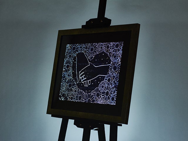 (金墨汁で大量に「ありがとう」と羅列された作品も、部屋を暗くすると....)