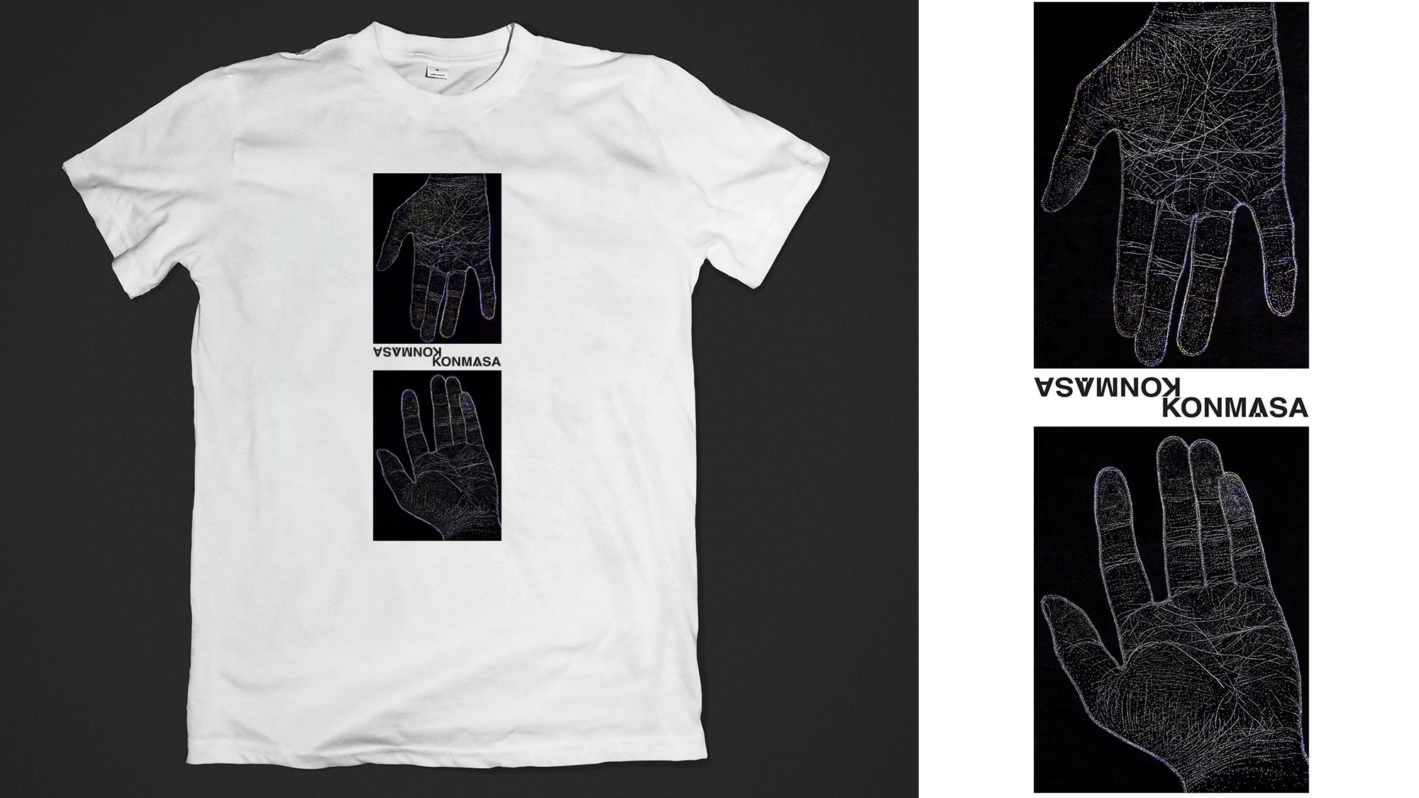 ・KONMASAが自身の手を穴で忠実に再現した作品「掌中天河」。制作の発端は手の皺が細かく多い事がコンプレックスだったが、不思議と眺めているとその流線に銀河の流れを感じ、いつしか愛着を持つ様になったからである。こちらはその作品を本人が撮影し、Tシャツに印刷したものです。クラウドファンディング限定商品です。