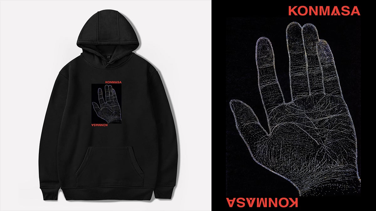 ・KONMASAが自身の手を穴で忠実に再現した作品「掌中天河」。制作の発端は手の皺が細かく多い事がコンプレックスだったが、不思議と眺めているとその流線に銀河の流れを感じ、いつしか愛着を持つ様になったからである。こちらはその作品を本人が撮影し、黒のフーディーに印刷したものです。クラウドファンディング限定商品です。