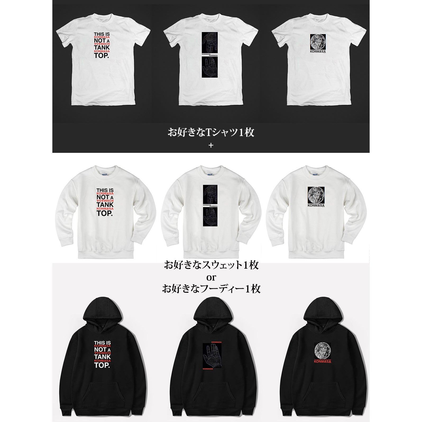 ・常にタンクトップを着ているKONMASAによるデザイン、「THIS IS NOT A TANK TOP.」を白のスウェットに印刷。こちらはクラウドファンディング限定です。