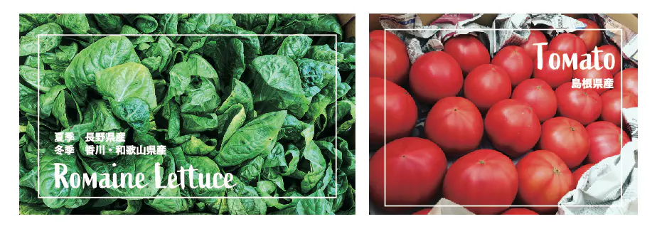野菜は季節ごとに県内外から旬のものを取り寄せています。とくにロメインレタスは島根県内ではほとんど市場に出回らないため仕入れが大変ですが、ロメインレタスの美味しさもたくさんの島根の方に知って頂きたいので、サプライヤーさまにもご協力頂きながらなんとか頑張って仕入れています。また、トマトは出雲市乙立町で栽培されている美味しいトマトを使用しています。