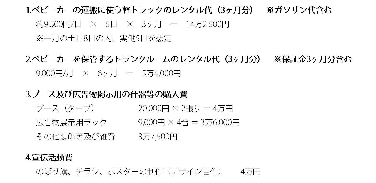 また、イベントに出店する際のブース代やベビーカー本体の費用、ベビーカーを運ぶための運送費、人件費、その他もろもろの経費がかかりますが、