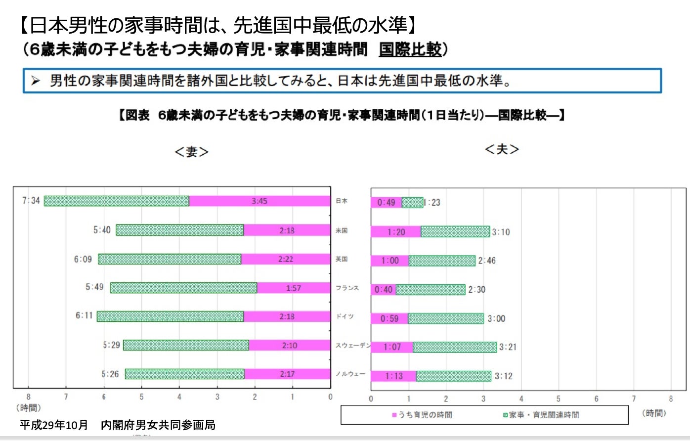 アメリカ人主婦と比べて1日あたり約2時間、イギリス人主婦と比べて約1,5時間。 その他先進国と比べても、ダントツに長い時間を、毎日家事と育児に費やしています。 (内閣府調べ)