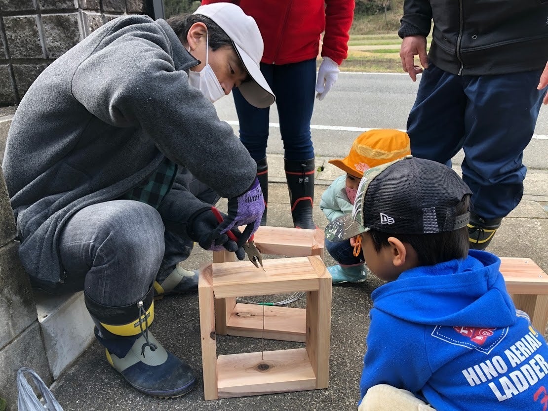 この日の作業は、ミツバチの巣箱づくりとシイタケの菌うちでした。
