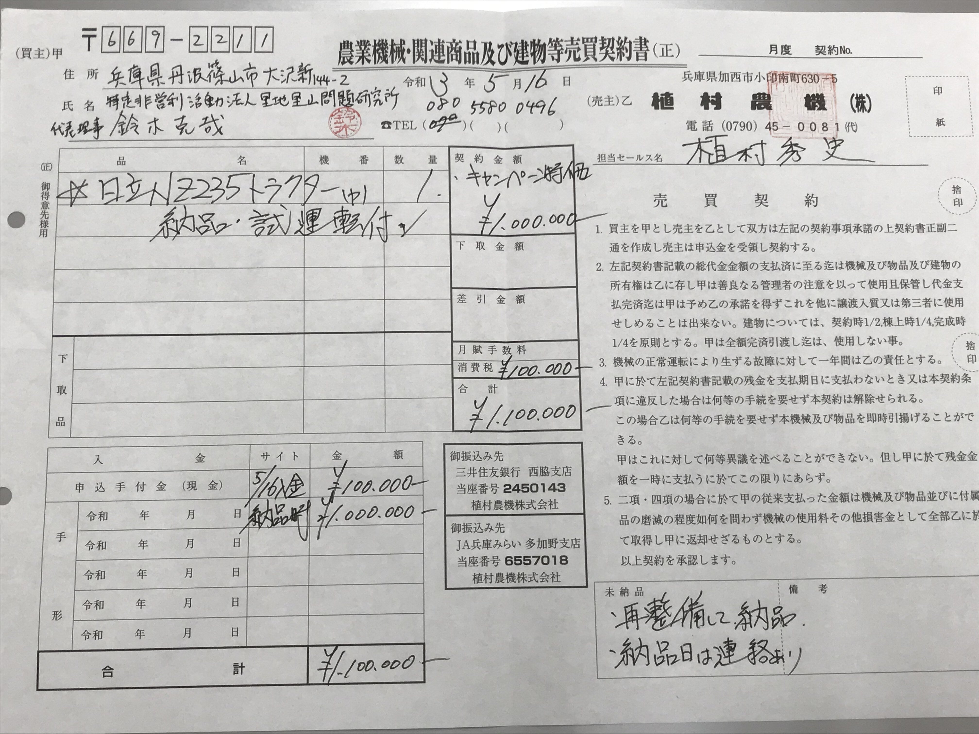 さともんの活動や川阪オープンフィールドの取り組みについても、しっかりと説明させていただき、こちらの予算に合わせて特別キャンペーン価格にしてくださり、トラクターの売買契約を結びました!