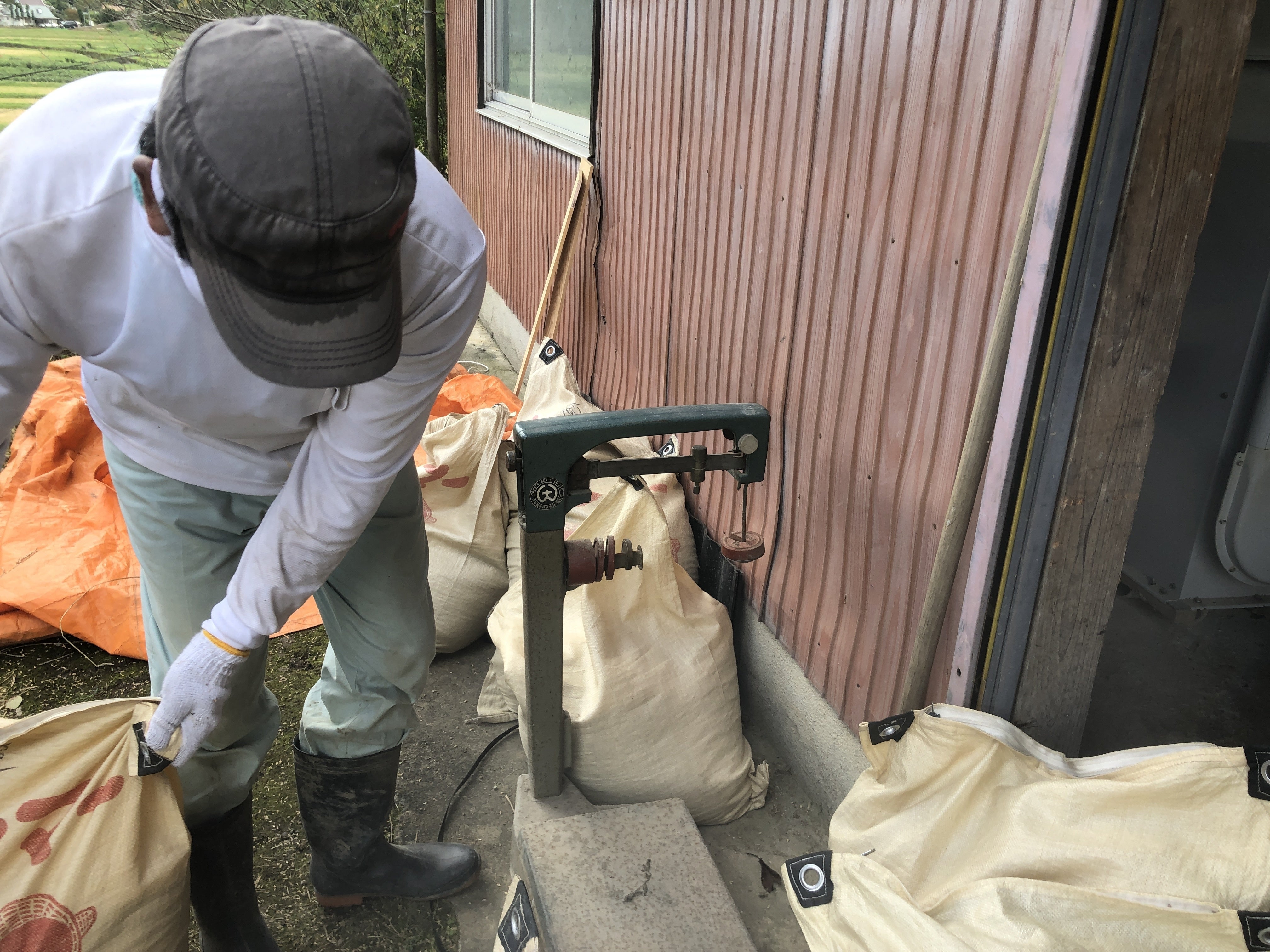 もみ殻がついた状態でですが、10~11袋程、重さにして約300キロの収穫をすることができました。こんな感じのはかりで計測します。