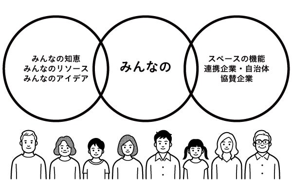 従来に無い新しいコンセプトと機能を備えた場なので、一言で表現するが難しいため、今あるもので近いと思われる、神社や公民館から「未来型公民館」と表現しましたが、いろいろな人たちとワクワクする未来を創っていく場として、ぼくたちが考えているオープンコミュニティースペース「みんなの」をご紹介します。