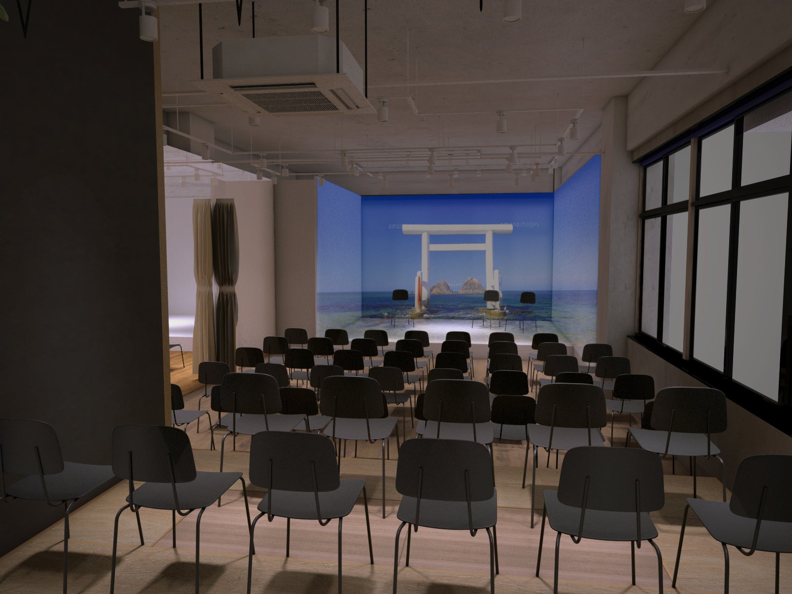 イベント用にスタッキングチェアを倉庫にご用意しています。最大収容人数は50名(立ち見の場合70名程)規模のイベントが開催できます。イベントに必要なプロジェクターや音響はそろっていますので、安価に且つスピーディーにイベントを実施できます。そして奥には4面プロジェクションマッピングを設置。4面プロジェクションマッピングでは、まるでそこにるかのような没入感を可能にし、糸島の観光地のシュミレーションやその伝達力を発揮したプレゼンテーションなど今までに無い体験やイベントを行えます。