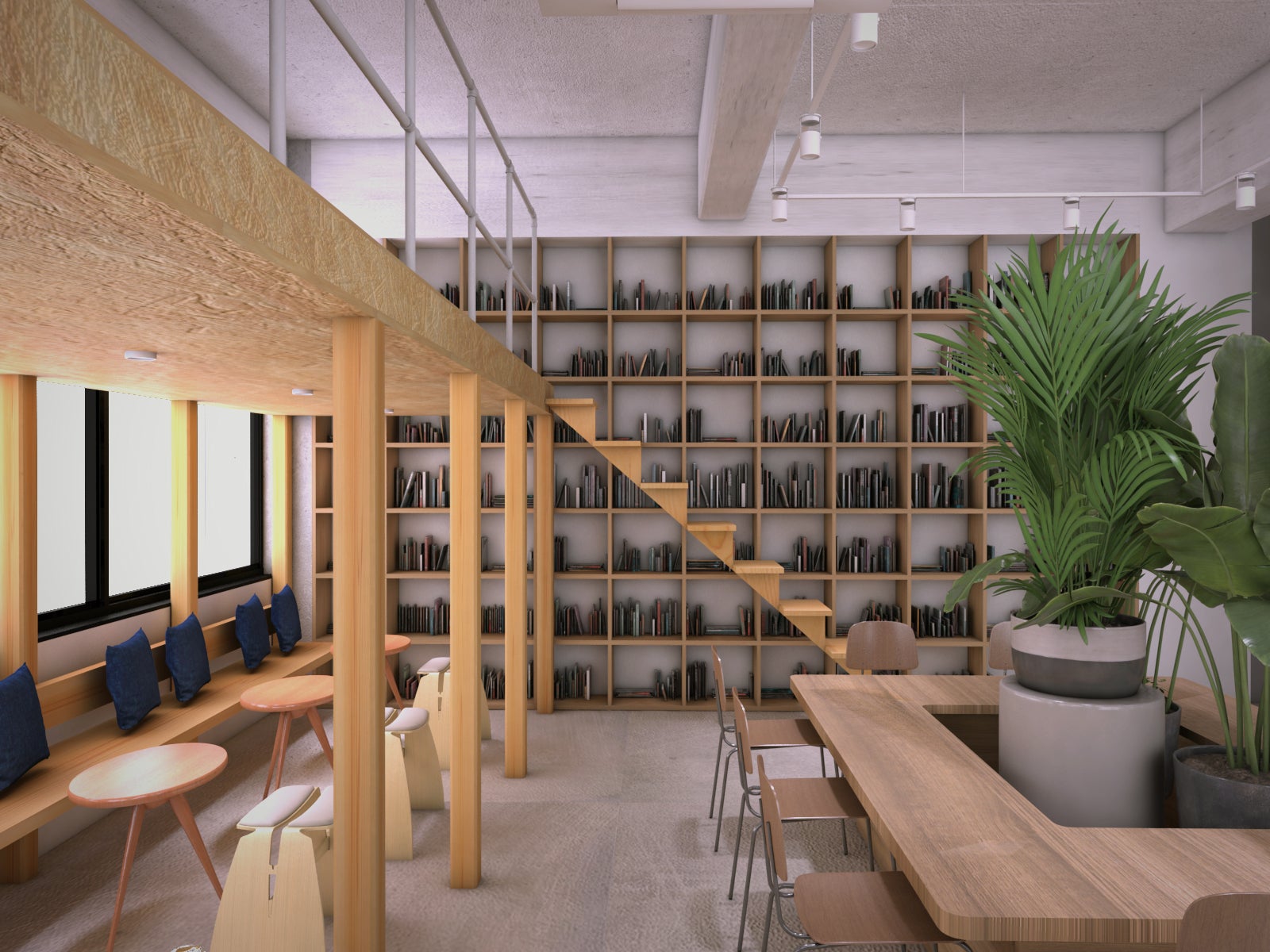 コワーキングスペースの端には、中二階スペースを用意。ちょっとだけ目線が外れて集中して本を読みたい方や、ソファに座ってゆっくり仕事がしたい方向け。独特な秘密基地感がありますので、子供にも人気のスペースになってしまうかもしれません。