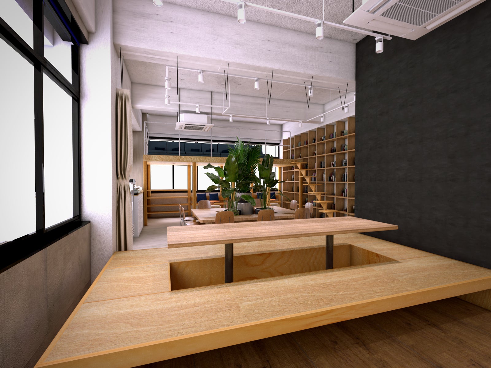 施設中央に設置する掘り炬燵テーブルは、最大8名まで利用可能です。ちょっとした打合せや、大人数での談話スペースに最適です。テーブルの天板部分は収納が可能ですので、使わないときやイベント時には収納することで、フラットな小上がりスペースとしても使用することができます。